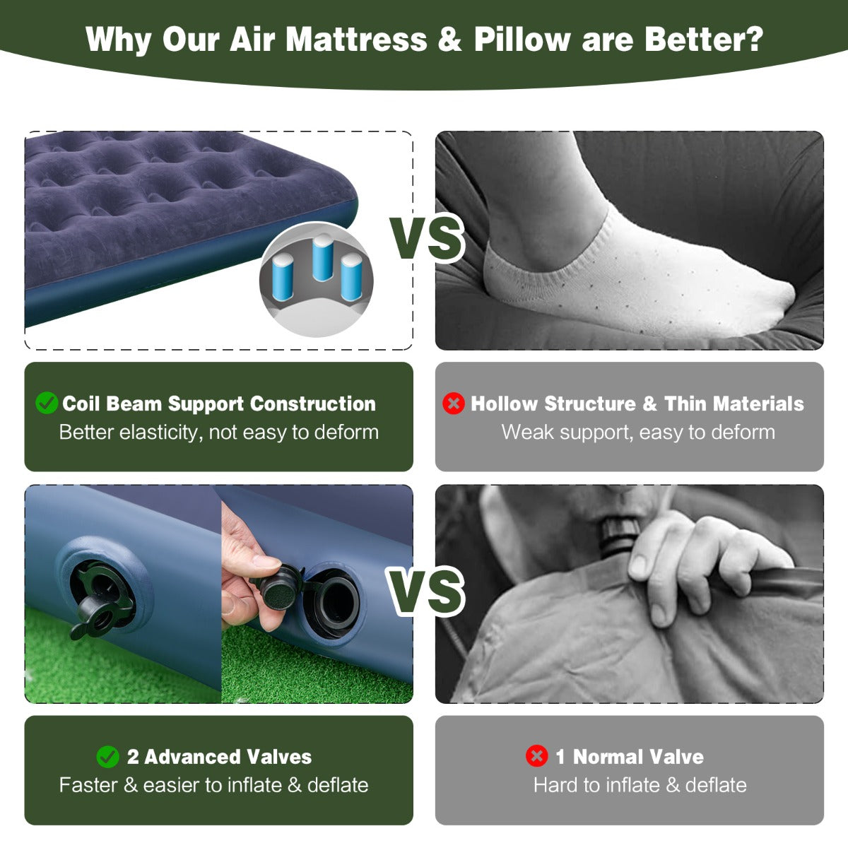 Comfy Air Mattress & Pillow: Why our air mattress & pillow are better? Currently, the interiors have been upgraded to 22cm thick coil beam support constructions, with more elasticity and better resisting deformation. More, 2 advanced valves work very well for quicker and better sealed inflation & deflation. As needed, 2 inflating ways are available, step to inflate or use an electronic pump (not included).