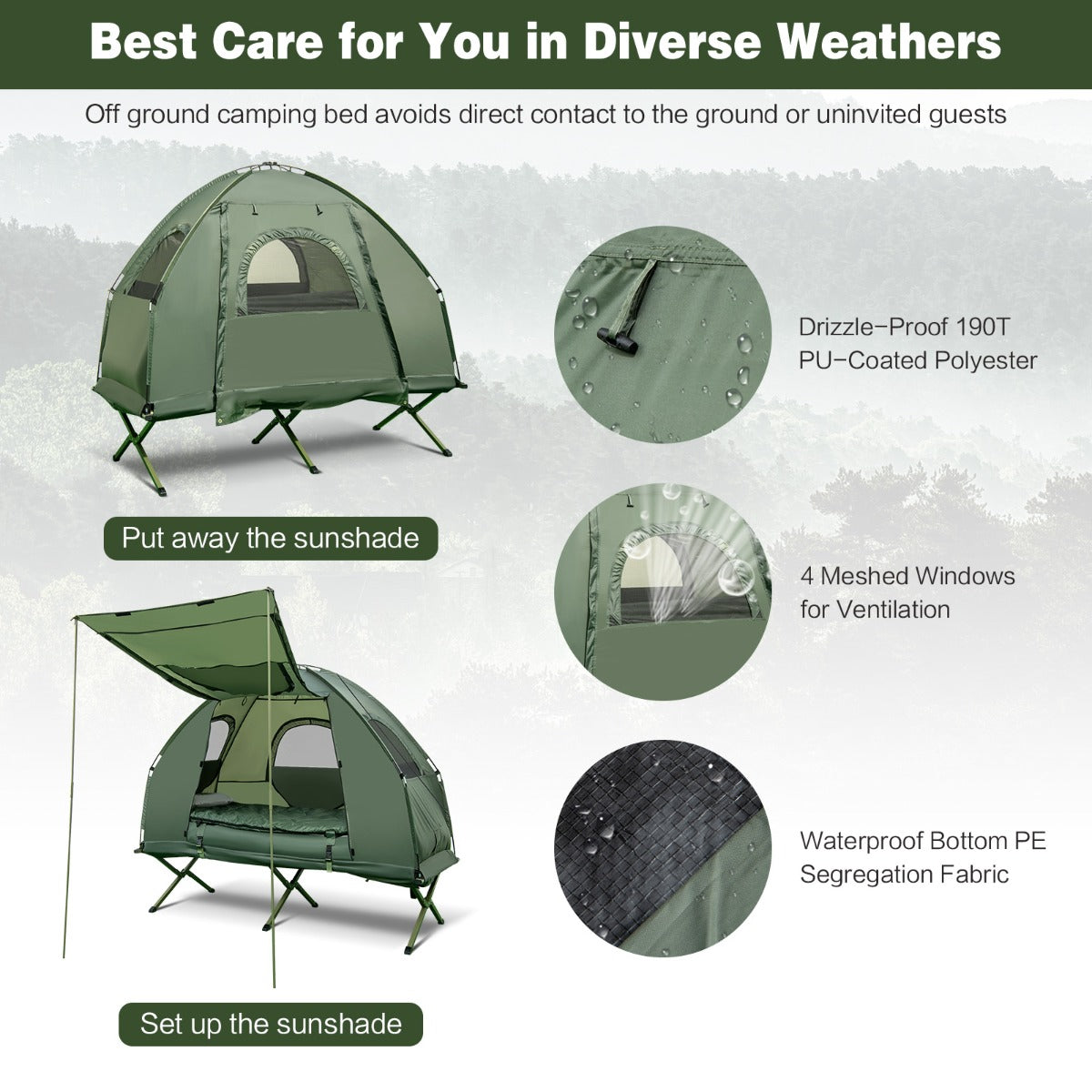 All-Weather & Elevated Design: Best care for you in diverse weathers, the tent cot is made of 190T PU-coated polyester with proper drizzle resistance, while it comes with a large sunshade to block direct sunlight. Plus, the camping tent is 42cm off the ground and has a bottom PE segregation fabric to avoid a wet floor and uninvited guests.