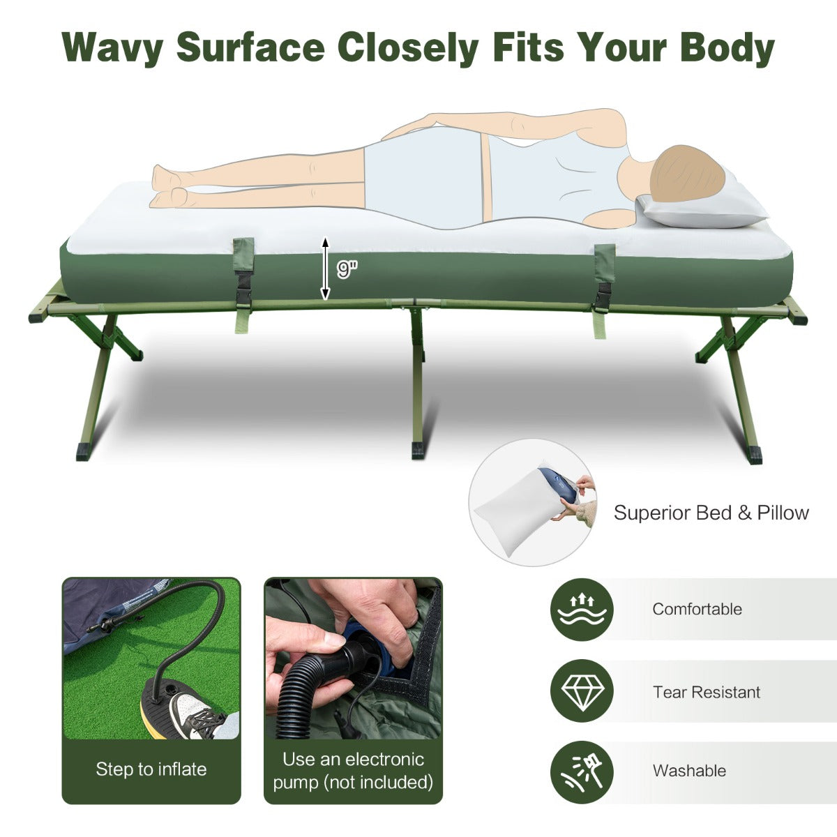 Take the 5-in-1 camping tent cot for your adventures! You will receive a tent, a camping bed, an air mattress, an air pillow and a sleeping bag, all covers will be offered. Based on reality, the tent cot can be turned into various forms, like a bedding set, an elevated camping bed, a floor tent, etc. For outdoors, the tent is made of 190T PU-coated polyester and fitted with bottom PE segregation fabric to resist drizzle and a wet ground. Since it is 42cm elevated, uninvited guests will be isolated. Also, there is a large sunshade and 4 meshed windows for coolness. As for stability, both tent and camping bed are crafted of strong materials, like metal, FRP poles, to enhance sturdiness. You can use included metal stakes and ropes for further fixations. More importantly, air mattress and pillow are upgraded with 9" thick coil beam support constructions for better comfort. 2 scientific valves are offered as well to ensure quick and sealed inflation. Finally, the folding camping tent cot allows for 2 ways to inflate, step to inflate or use an electronic pump (not included).