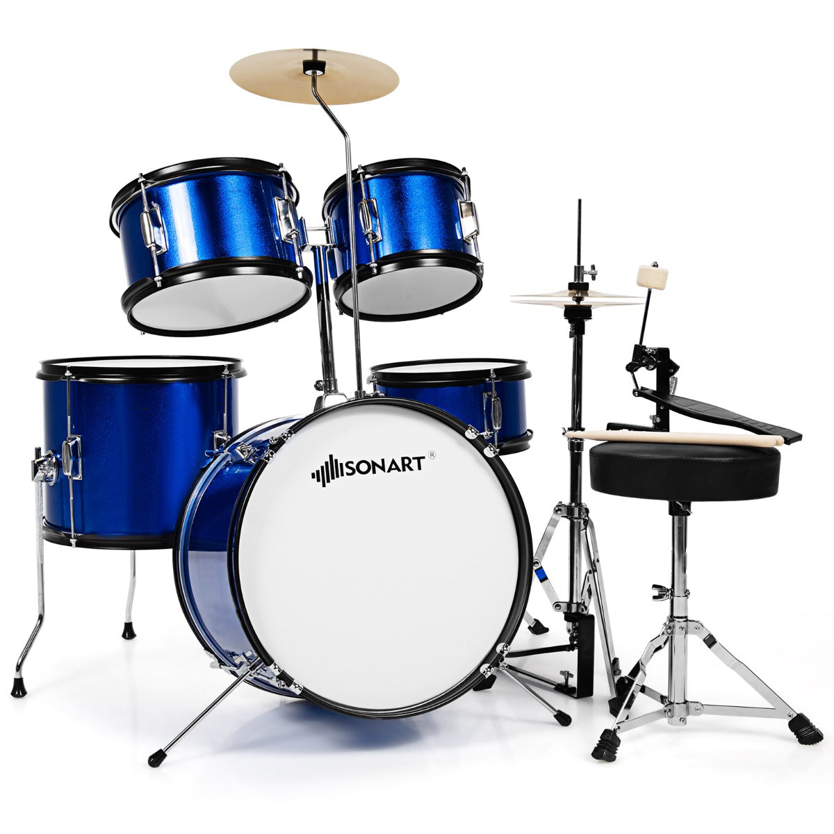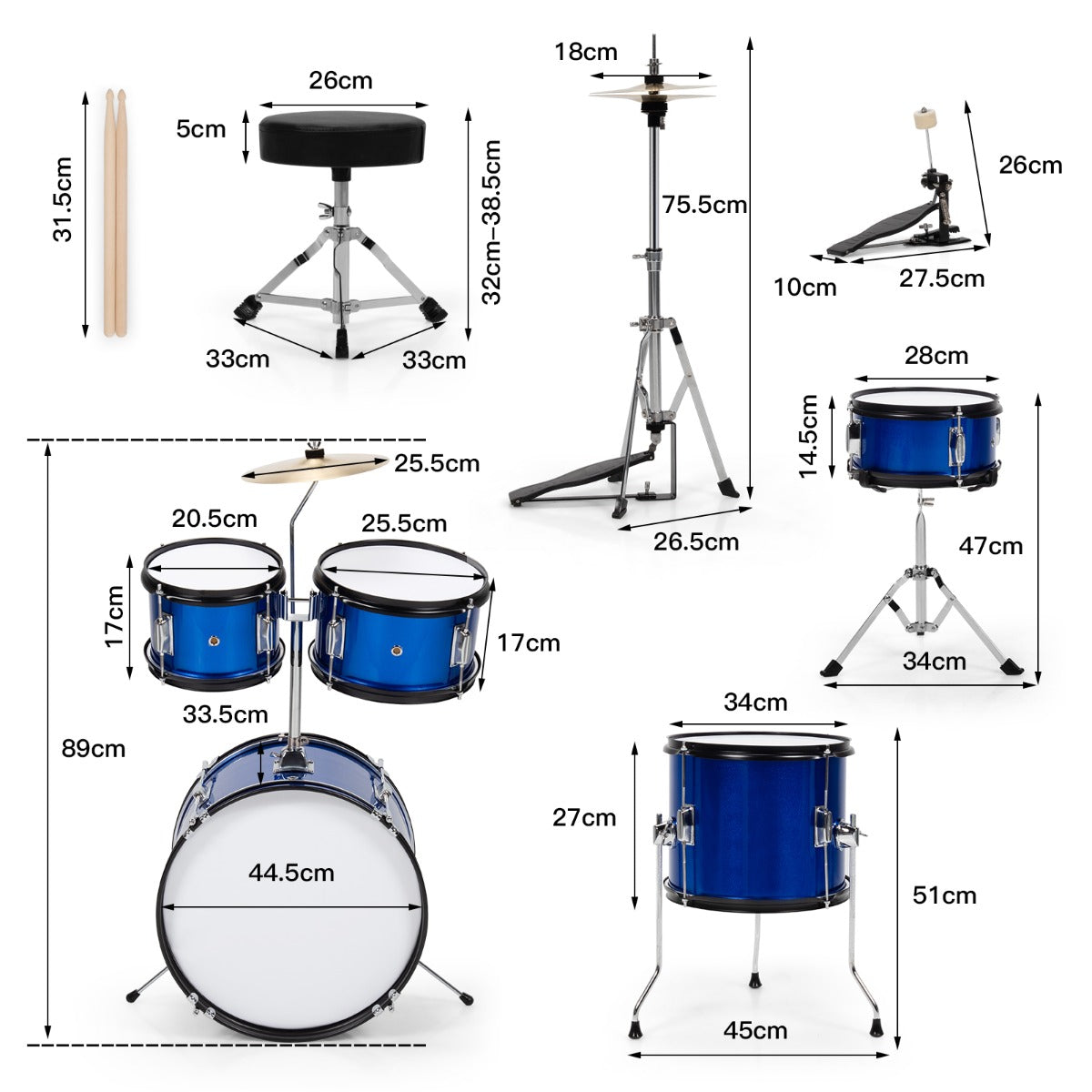 3-piece Instrument Set Includes: A 25.4 cm crash cymbal, an 20.3cm x 17.7cm tom drum, a 25.4cm x 17.7cm tom drum, 34.2cm x 26.6cm floor tom, an 27.9cm x 15.2cm snare, a 44.4cm x 33.0cm bass drum and an 20.3cm Hi-Hat. We also throw in 2 solid wood drum sticks, a bass drum pedal, and an upholstered drummer seat for complimentary. In addition, the seat has 3 height adjustments.