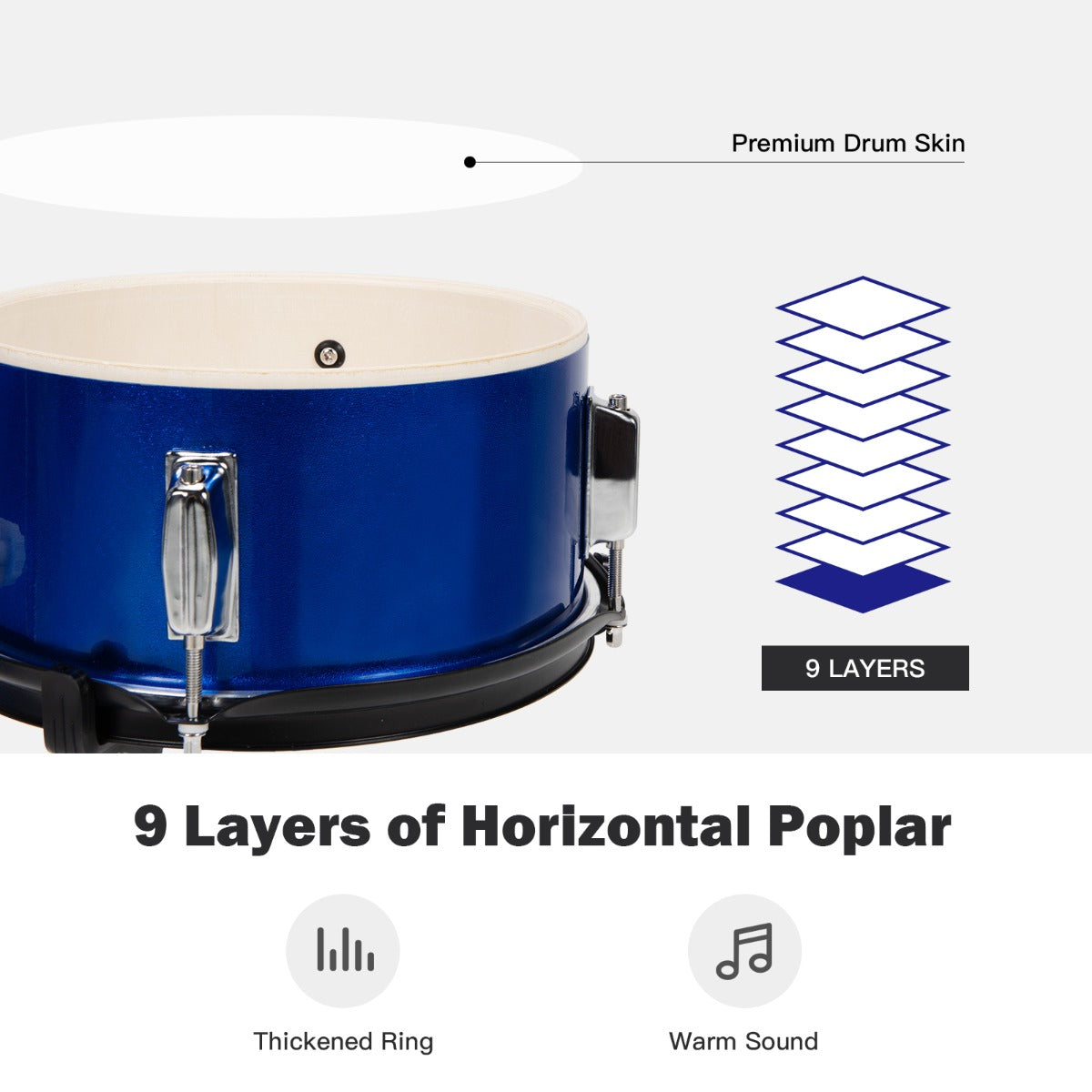 Start your little jazzman's dream from our kids' drum set. This percussion instrument set is manufactured with top components. The drums have 9-layer hardwood shells with premium drum skin to play a beautiful drumbeat. And the cymbal, which is forged by stainless steel, shows a crisp and clear sound. Including 3 toms, a bass, a snare, a Hi-Hat, and a cymbal, this drum set is compact yet has everything you need to encourage your little drummer. It is suitable for starters who just show interest in music or the promising young drummers as well. The strong electroplated drum lungs and stands hold the instruments sturdily. And this set comes with 2 hardwood drumsticks, a bass pedal, and a height-adjustable seat. Besides, this drum set has a high gloss finish, which will look fantastic on a stage or in your home.