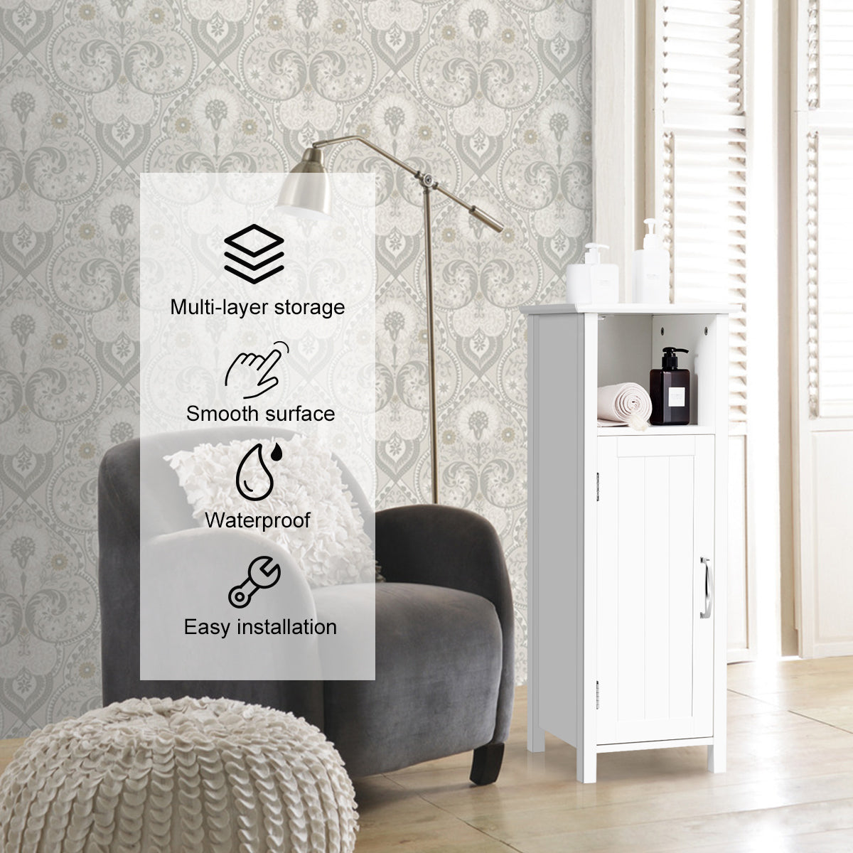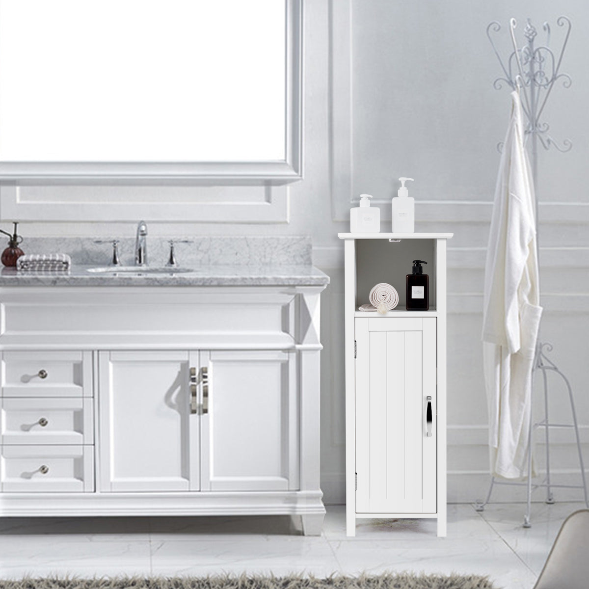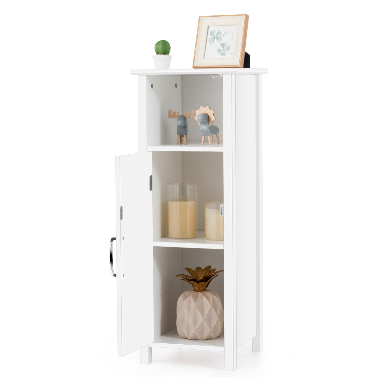 This is our simple and stylish storage cabinet. It is made of MDF, which is waterproof and durable. Premium material and rugged structure give you a perfect cabinet for durability and long life. A large storage space can help you better classify your items. The open top compartment of the cabinet can be used to hold some items for daily use, and your extra items can be placed behind the door. The storage cabinet has height-adjustable shelf to meet your storage needs for items of different heights. This elegant cabinet is an ideal solution for bathrooms, kitchens, living rooms and bedrooms. By the way, featuring anti-tipping devices, this cabinet is safe to use.