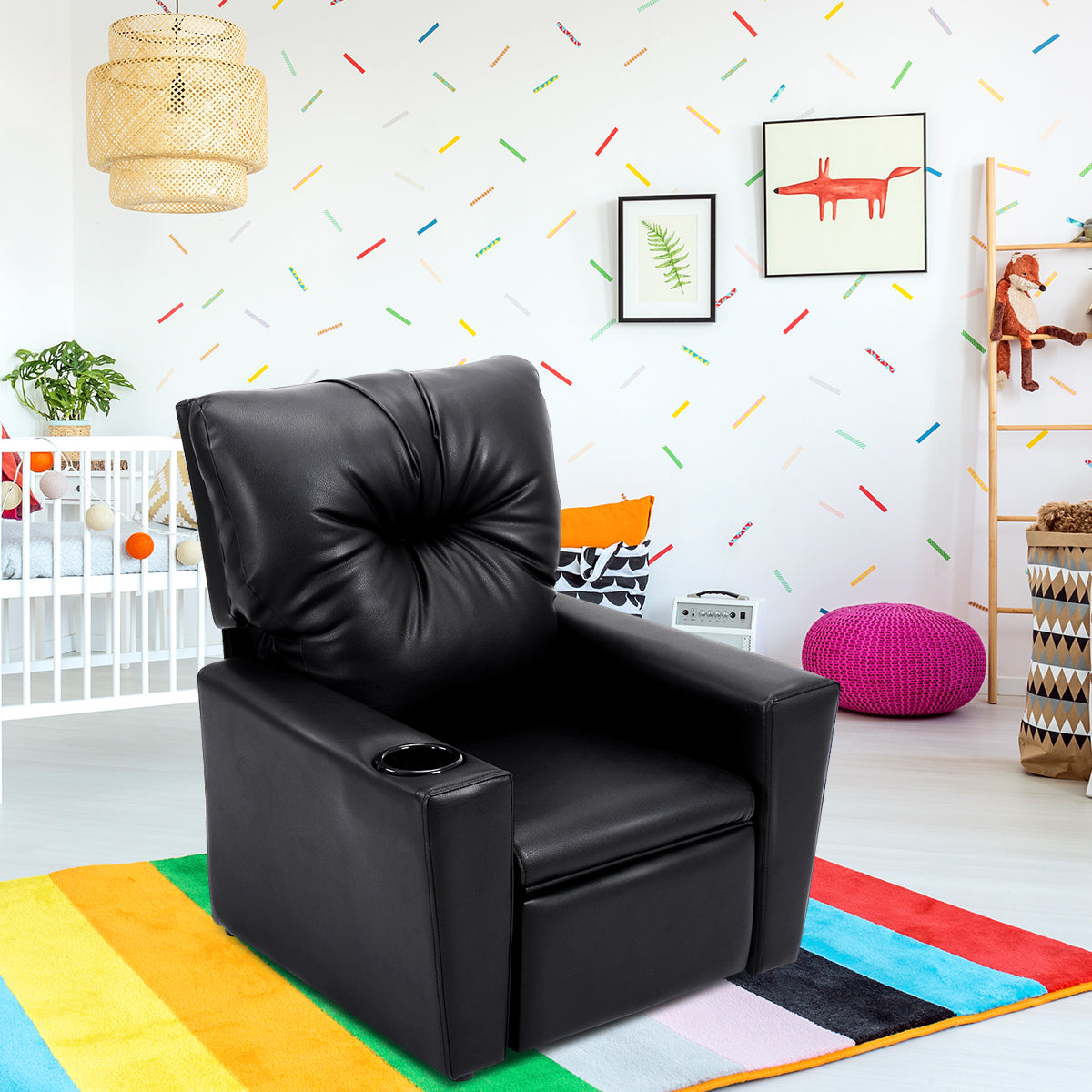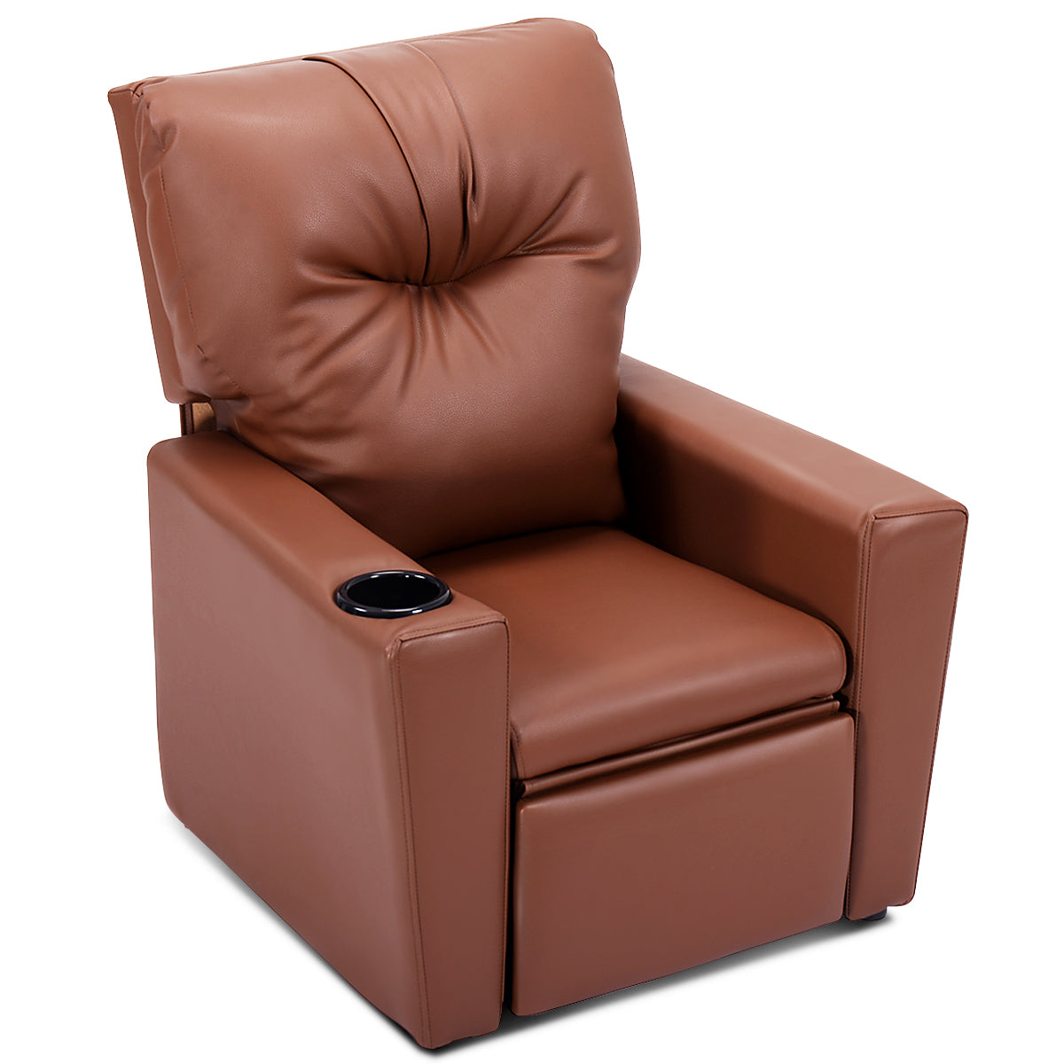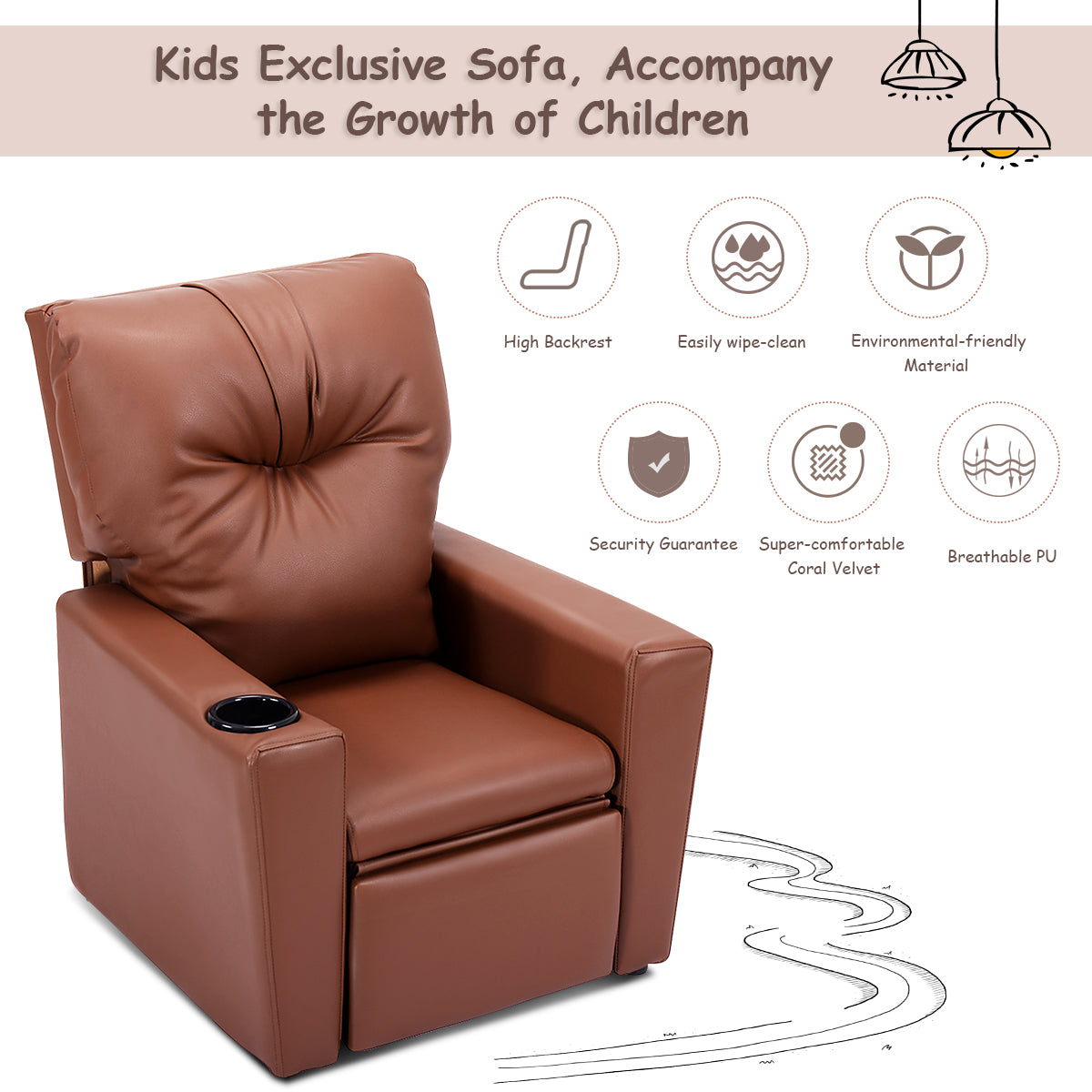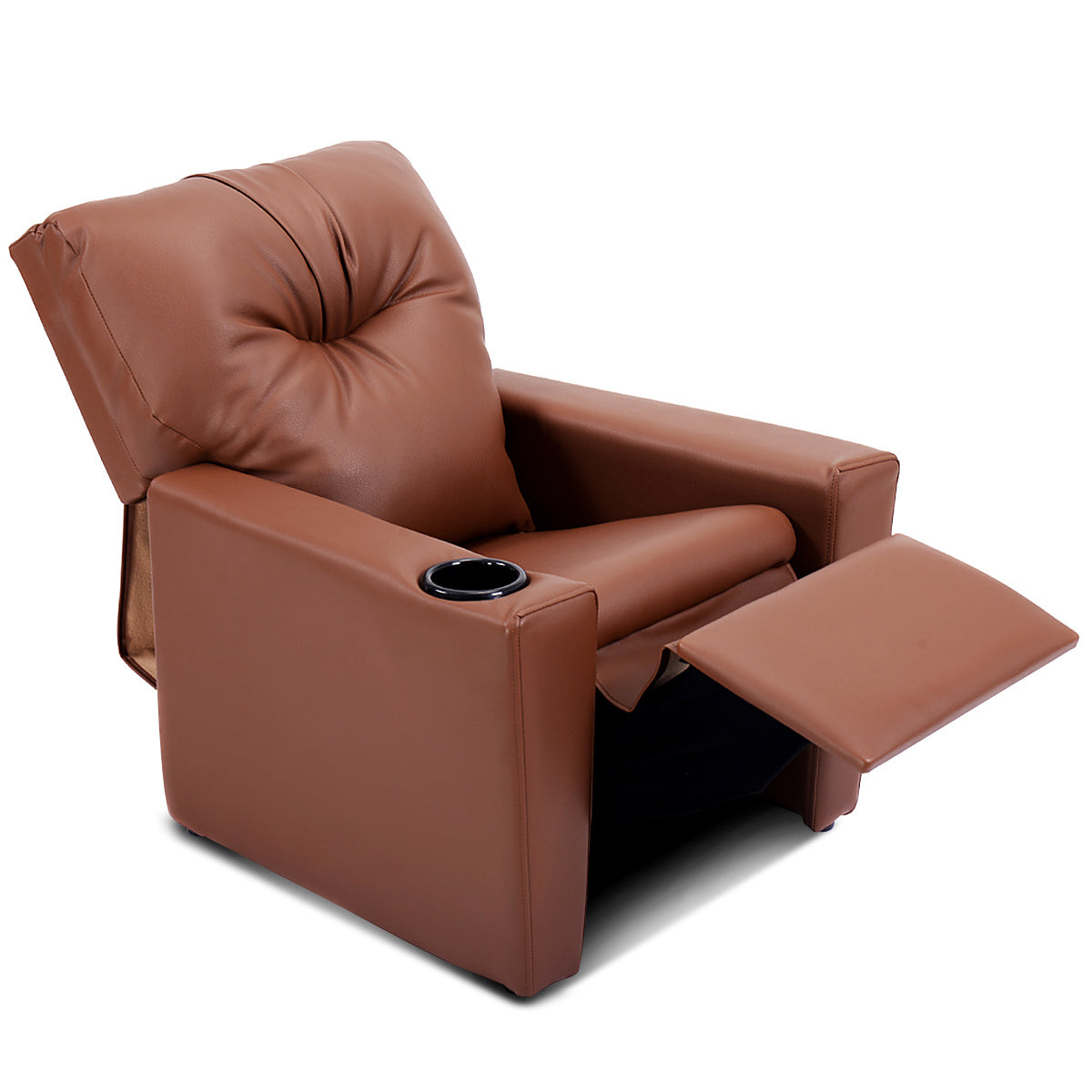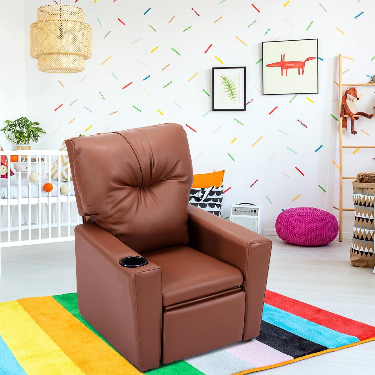 Bring 2 seats in 1 purchase, and gives your kids more enjoyment for reading, writing, sleeping and etc. The adjustable design allows you to adjust the backrest and footrest, and the cute recliner will not only offer superior comfort, but also help kids to sit in an upright position. Thick and high resilient sponge fits the body line perfectly, while the soft cotton supports body with great load capacity up to 60kg. Also, the built-in cup holder adds more convenience for you to have a cool beverage within reach. With high quality material and sturdy construction, the stability promises the security as it's impossible to turn over, and the PU leather is very gentle to skin. Cute appearance is brings more loveliness to your home, which fits perfectly to various decoration style as well, so you can set it in bedroom, living room and etc. Last but not the least, the durable material and wear-resistant PU leather ensures a long-term use, meanwhile easy maintenance and assembly save you time and labor.