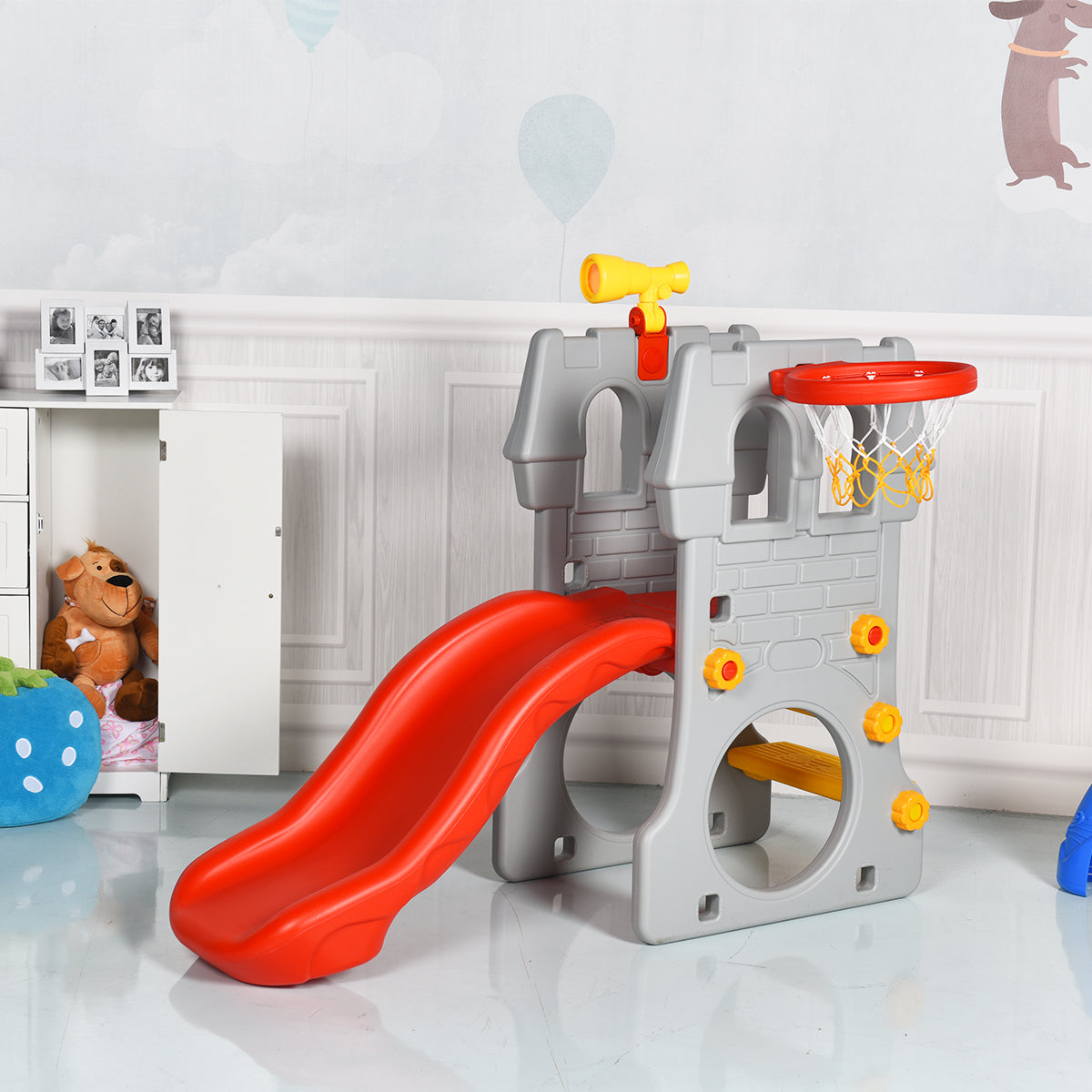 Every little kid will love playing on the huge slide. This multi-purpose toddler slide features a basketball hoop, telescope toy, fun slide, climbing ladder and football goal for playing. It provides the perfect place for children to shoot, play football, climb and other sports. Made of environmentally friendly and durable HDPF, it is not easy to wear and deform, allowing children to play without worry. The sturdy and stable structure gives it a strong load-bearing capacity. Raised castle guardrail design ensures your child's safety during playtime. Toddlers will love to climb and slide on top and crawl underneath. Also your kids can play with their friends. It is the perfect gift for children, don't hesitate to buy it !