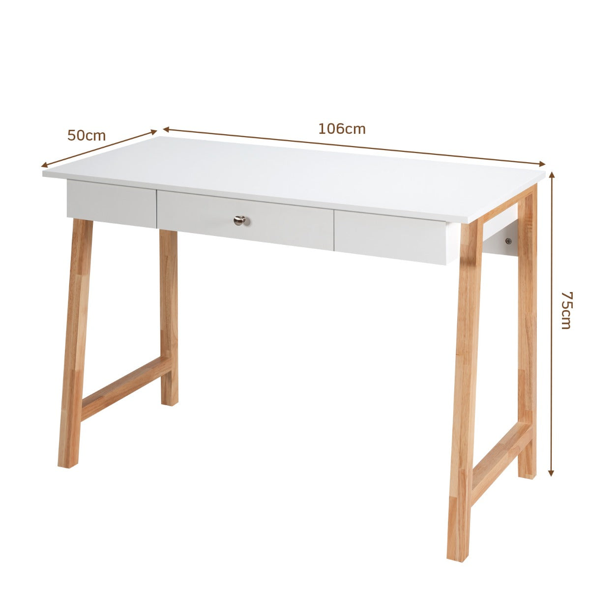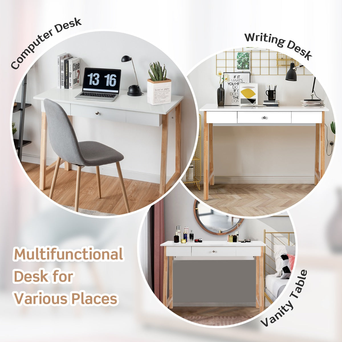 Our multifunctional computer desk will bring a lot of convenience and elegance to your life! The modern concise table can be used as a computer desk, writing desk and dressing table to meet all your needs. Featuring a spacious desktop and large drawer, this computer desk can organize your beauty essentials or office items in good order, offering you a neat working or make-up area. As for quality, this writing desk is made of premium MDF and solid wood legs, which ensure great stability and durability. 4 non-slip foot pads on the bottom provide effective floor protection and added stability. Smooth drawer slides and the round metal knob are designed for convenient use. Modern and simple style enables the desk to blend with any home decor easily and you can place this desk in the living room, bedroom or home office.