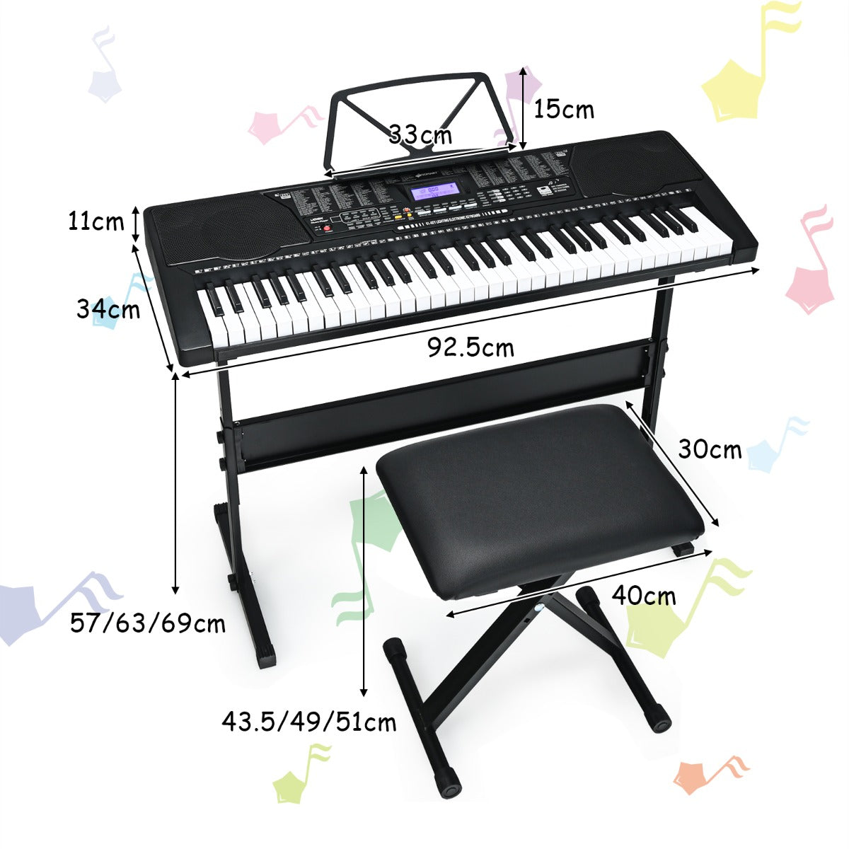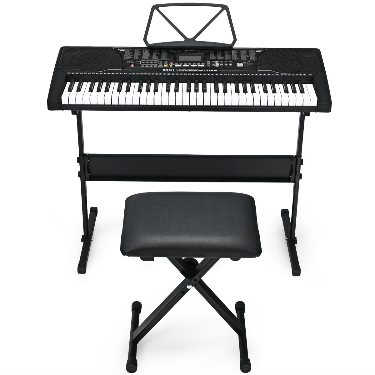 With 255 timbres, 255 rhythms and 50 demonstration songs, the digital piano offers a full range of sounds to develop your practice. In the meantime, the electric piano features a variety of built-in functions, such as sustain and vibrato functions, single finger chord and multi-finger chord, record and playback, MP3 and volume control and so on for continuous exploration and research on music. The stand with non-slip design can be adjusted to 3 different heights and keep stable at all times. The padded and foldable stool offers a comfortable sitting experience for hours of playing. There are two power supply methods: the adapter and the battery ensure that the keyboard can be played wherever you want. The combination of LCD display, illuminated keyboard and teaching modes are designed for you to improve skills of piano playing.