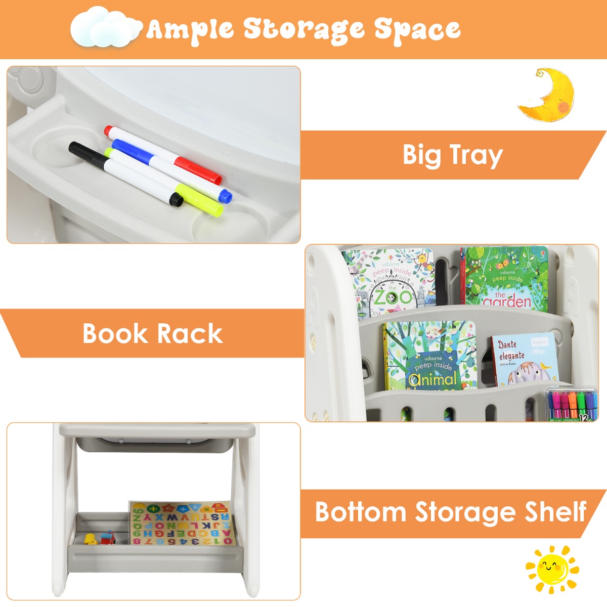 Large Storage and Folding Table: The table offers a 2-tier bookcase for storing children's favorite books, a pen tray and stationery under the whiteboard and a large space on the base for sorting and storing various things. The table top can be folded down to save space when not in use.