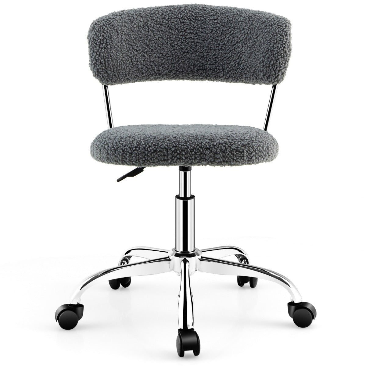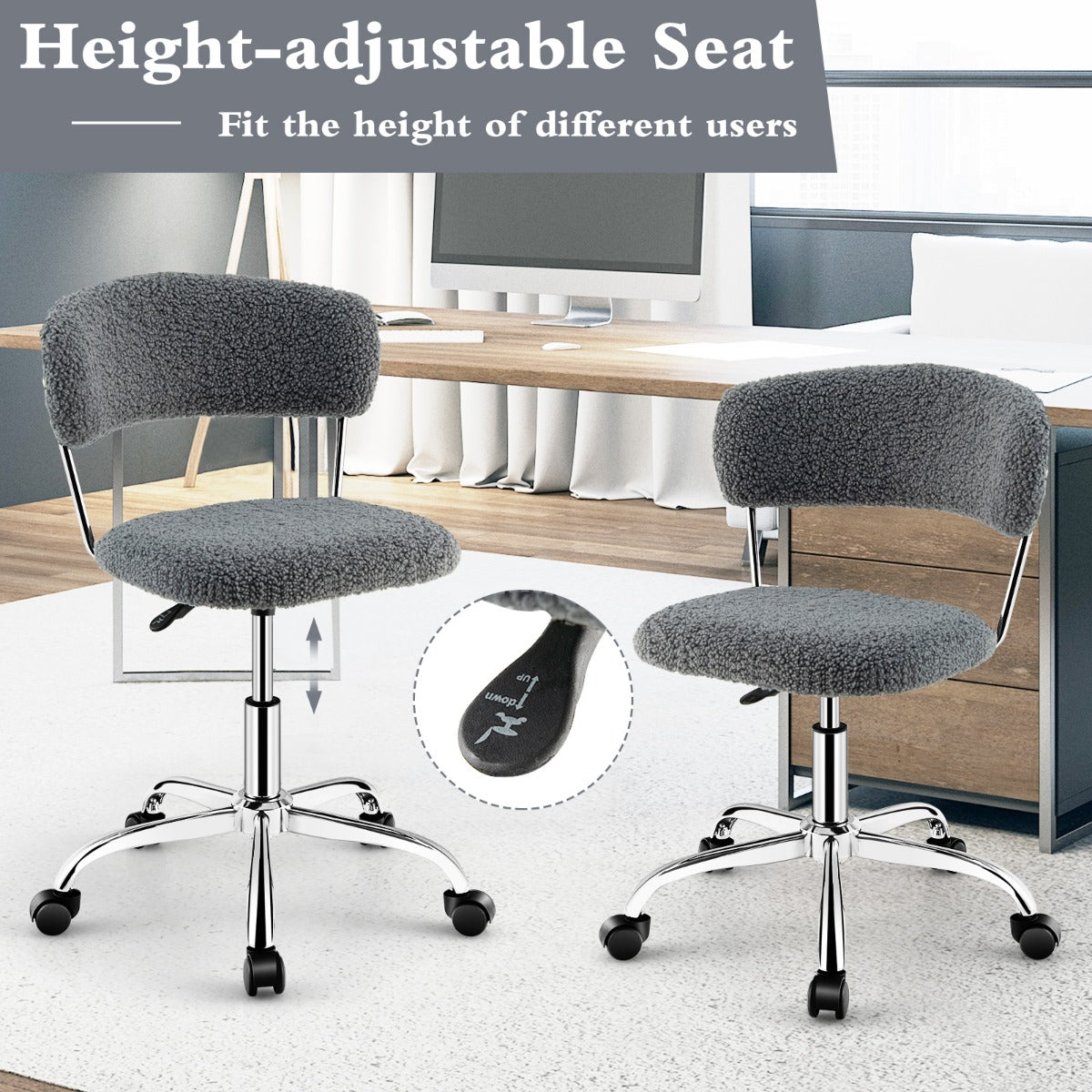 Enjoy your leisure time or working hours with this Sherpa swivel chair! It creates a cozy space with the furry Sherpa cover and thick sponge padding, giving you optimal comfort. Besides, the built-in plywood board and sturdy galvanized steel frame ensure reliable support for different users. And users of different heights can find the ideal position thanks to the adjustable seat design. Sitting on the computer desk chair, you can swivel by 360 degrees and easily go anywhere you like, as the rolling casters allow flexible movement. With all these features, you can use this armless chair as a computer desk chair, a vanity chair or a leisure chair, and enjoy it in different rooms.