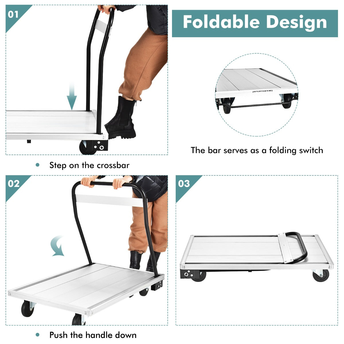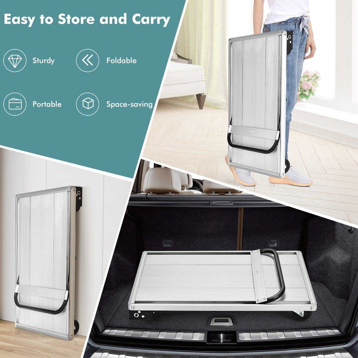 Easy to Fold & Store: It's worth noting that the handle of this push cart can be effortlessly tucked into the platform by stepping on the push bar. Hence, you can store this folding dolly in the corners to save your home space or put it in the trunk of your car.