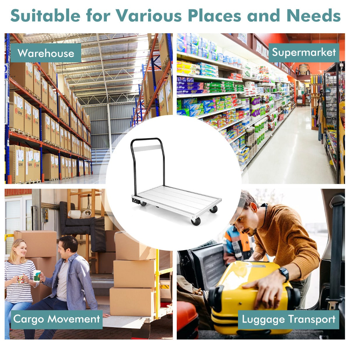 Multi-scene Usage: Featuring a practical and portable design, this portable flatbed cart can meet your needs on a variety of occasions. It's ideal for warehouses, supermarkets, restaurants, etc. Whether you want to transport cargo, luggage, household or office supplies, this push cart can help you save much labour.