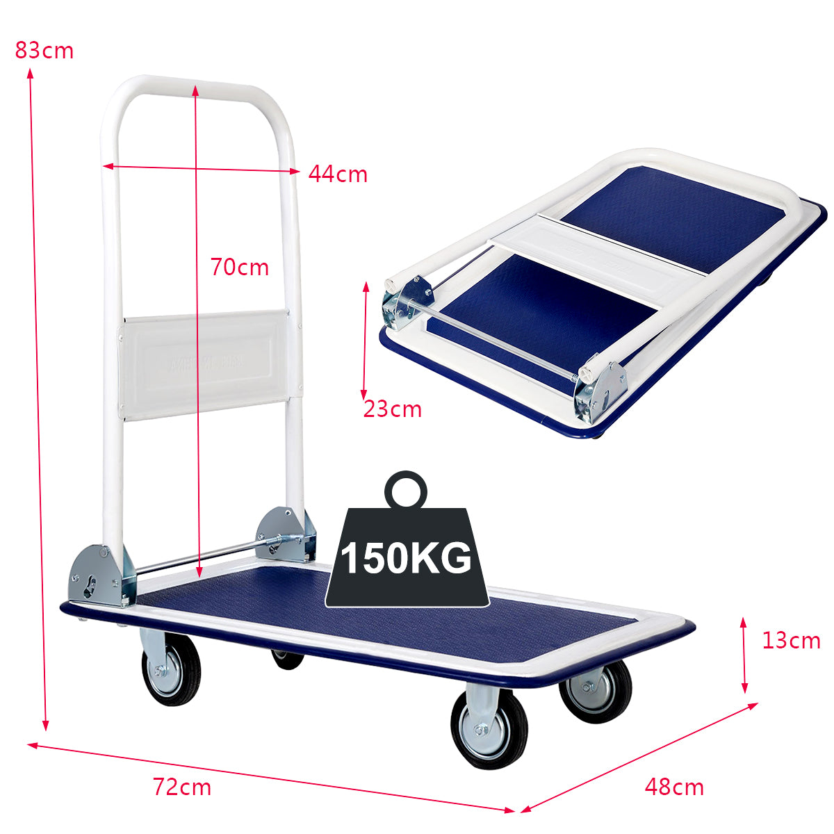 This compact platform cart is handy for moving objects that are too big to carry. Built with strong steel,it is well balanced and secure when heavy items are loaded. It runs smoothly, is easy to steer and easy to roll when pushing and pulling, making transportation work a breeze. This unit folds up tight and is lightweight and sturdy for stacking packages to easily maneuver across large bumps and tight corners. The assembly is simple and you can put the rotating wheels on the side with the handle so when you're pulling this dolly around by the handle it'll not drifting.