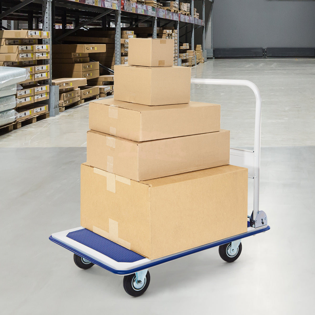 Sturdy Steel Construction: Built with solid steel for long-term use and functionality, the push cart is well balanced and secure, and the wheels don't go every which way when loaded with heavy items. The non-slip surface and the support baffle can help prevent the boxes or other goods from sliding or falling.