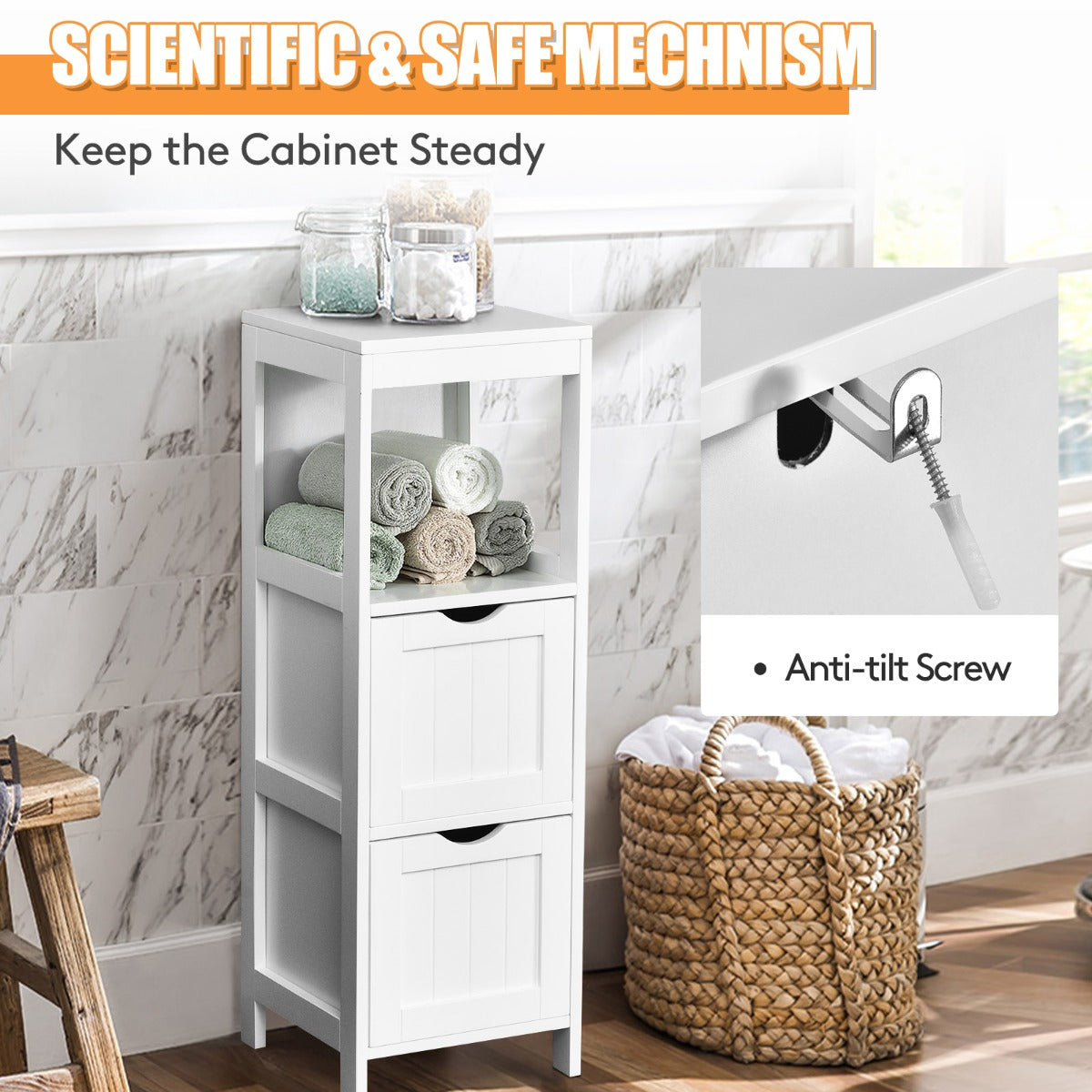 Designed for Durability & Stability: Made of solid MDF board, this storage cabinet is durable and sturdy to withstand the test of time. In addition, the bathroom cabinet can be fixed with an anti-tilting anchor in case of any wobbling or collapsing due to collision. Sturdy support legs also enhance overall stability.