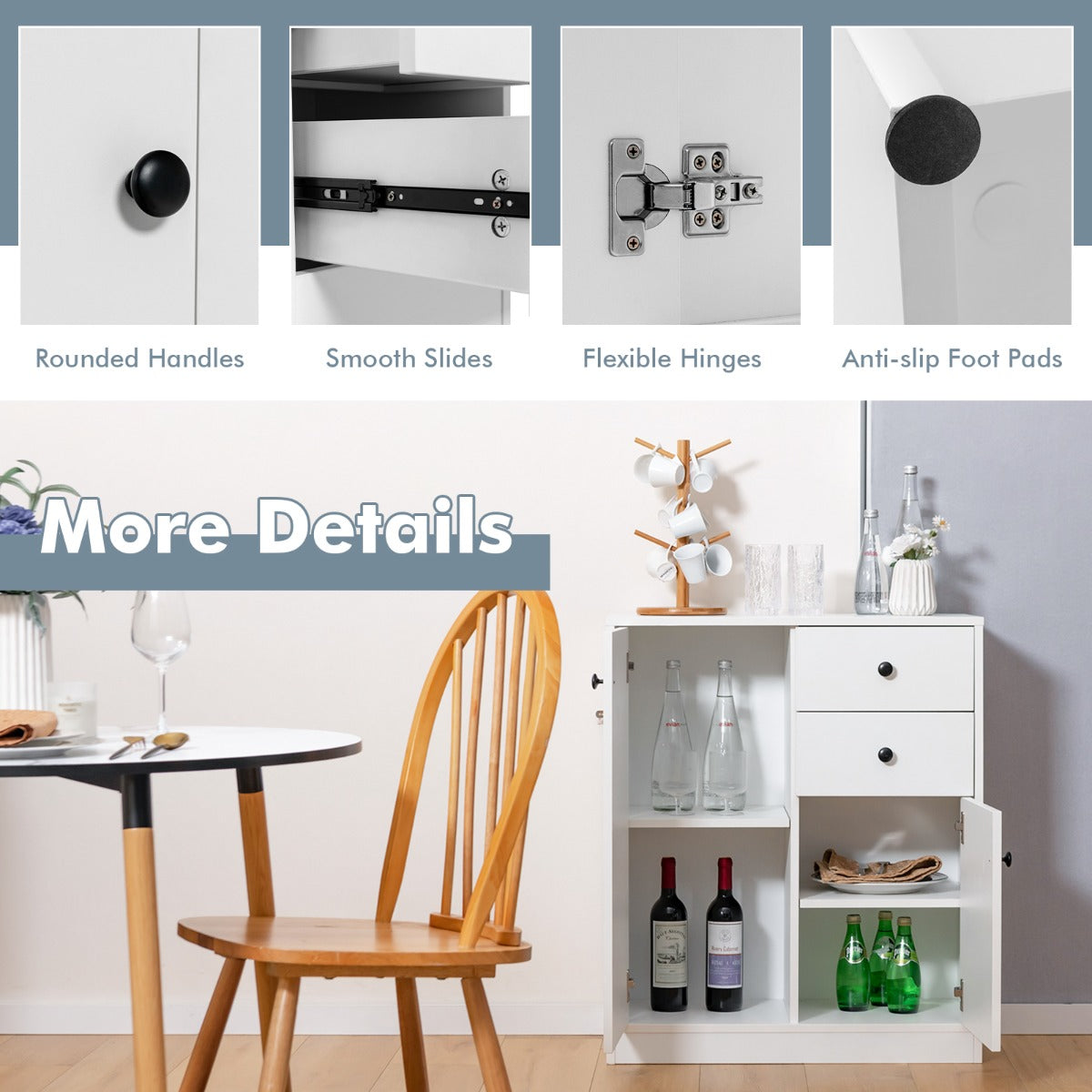 Intimate Design for Better Experience: Fitted with convenient round knobs, durable metal hinges and smooth drawer sliders, the kitchen sideboard ensures a pleasant experience to open the doors or pull out the drawers. In addition, the non-slip floor protectors at the base help to improve the stability and prevent scratches.