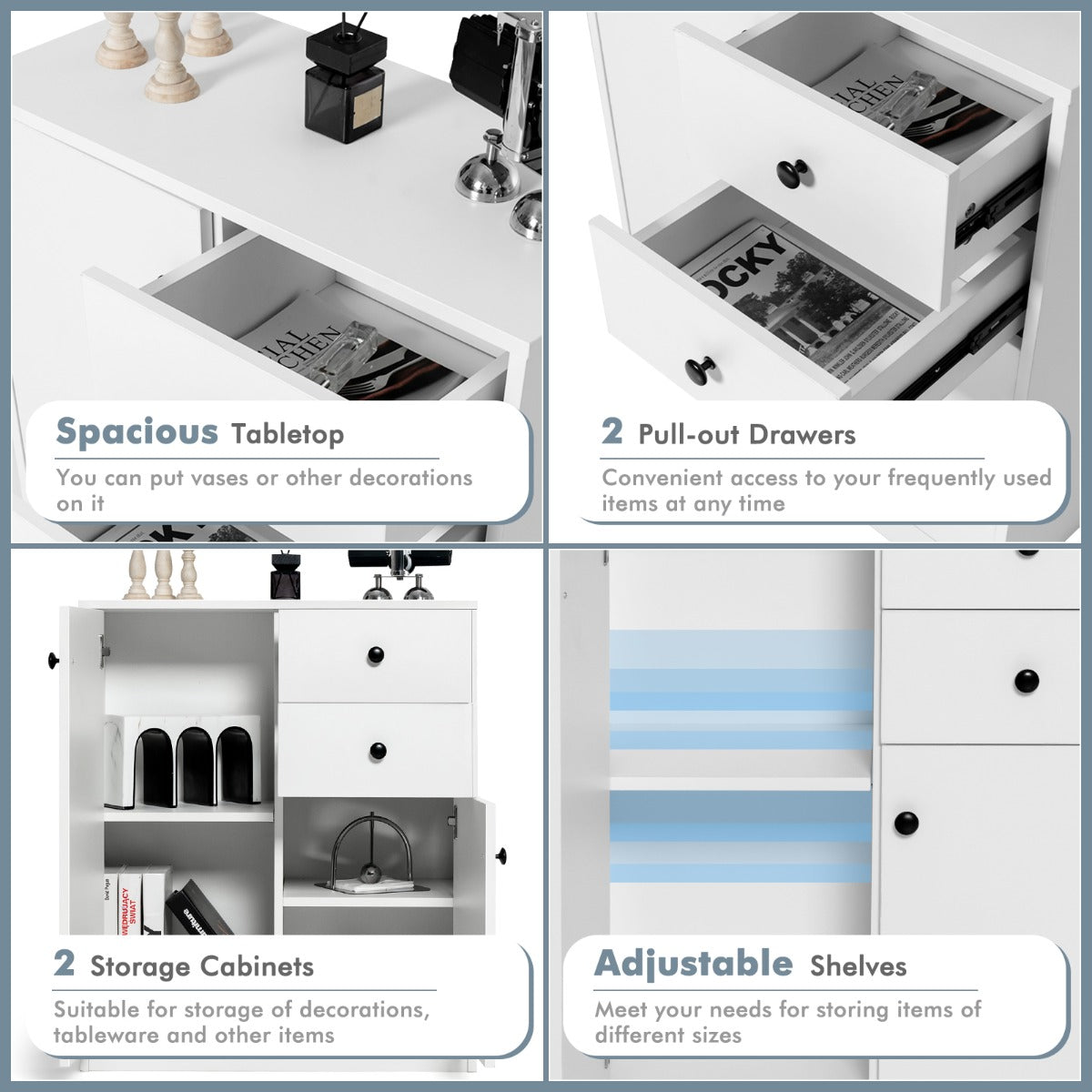 Flexible Options of Shelf Height: What's also worth mentioning is that you can customize the storage space according to your preference. The left cabinet has a 5-position adjustable shelf, and the right cabinet's middle shelf can also to adjusted to 3 positions. Plus, you can even remove the shelves for large interior space.
