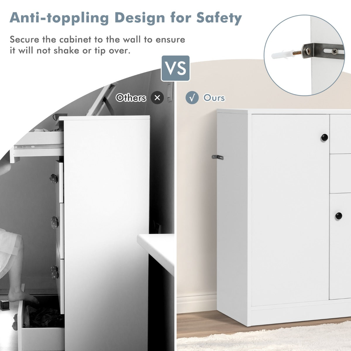 Comes with anti-toppling device to keep the cabinet form wobbling or tipping