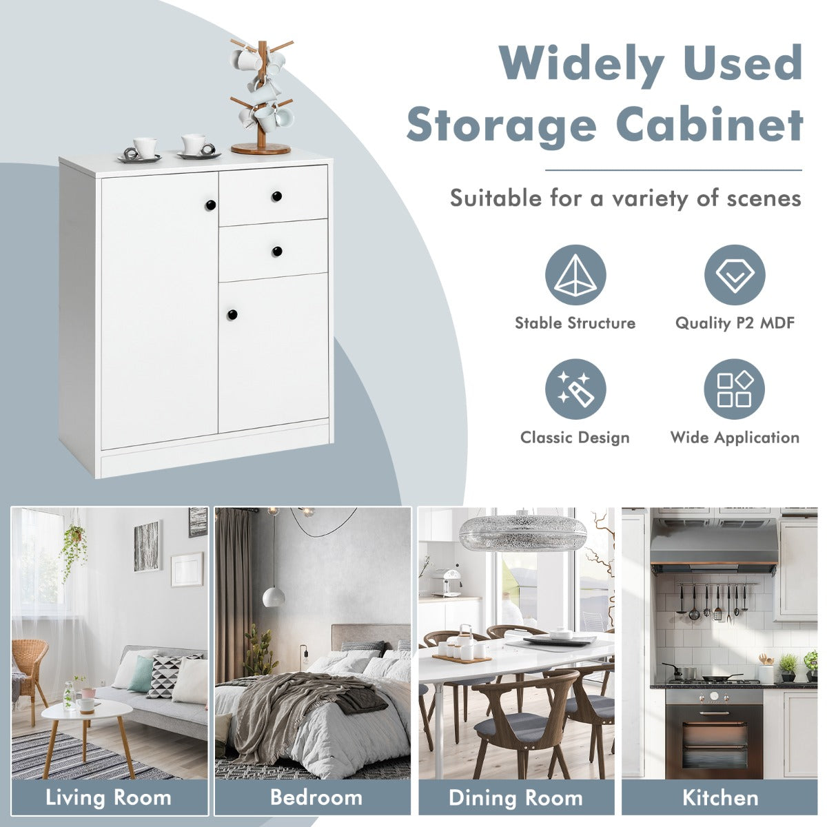 Modern Cabinet with Versatile Usage: The modern white cabinet with smooth and clean finish can blend into the contemporary room decorations and accent an elegant appeal. What's more, with powerful storage function and great sturdiness, the storage cabinet is widely applicable to bedrooms, living rooms, or hallways.