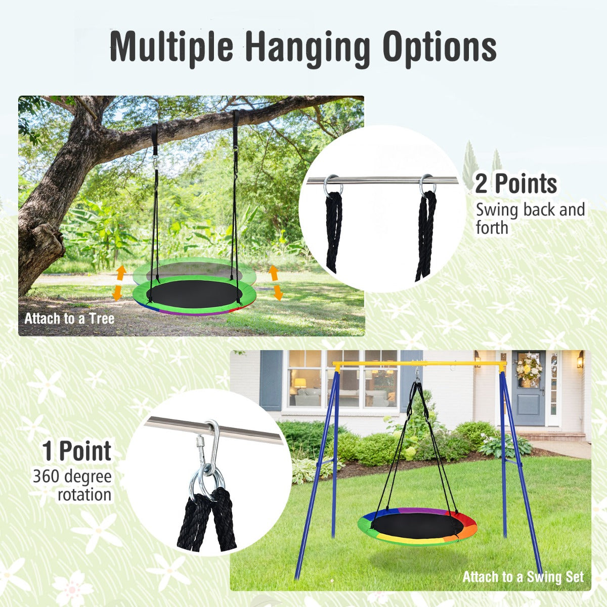 Customized Design: The flying saucer swing has multiple ways to connect: 2-point hanging to swing back and forth, and 1-point hanging to rotate 360 degrees. Furthermore, you can attach the swing to a swing set or a tree, and the height can be adjustable to meet different needs.