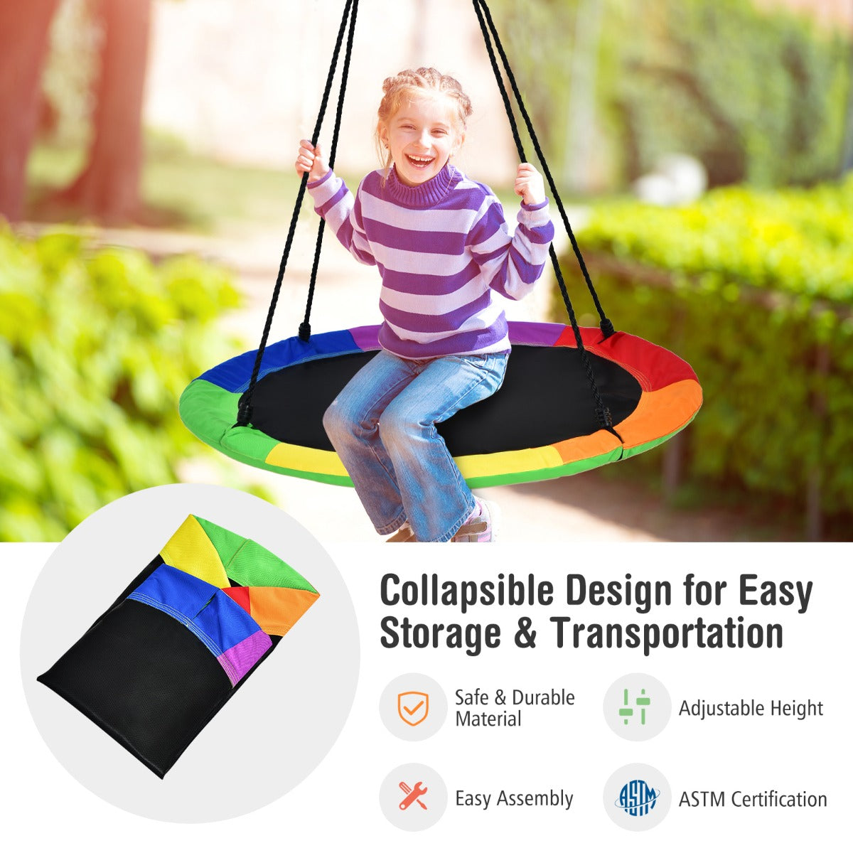Reversible Design & Easy Folding: Our round tree swing can be reversed through the round plastic ring in a second so that your kids have 2 choices of the seating surface. In addition, equipped with detailed instructions, the tree swing is easy to assemble. And the lightweight and portable design allow for easy storage and transportation.