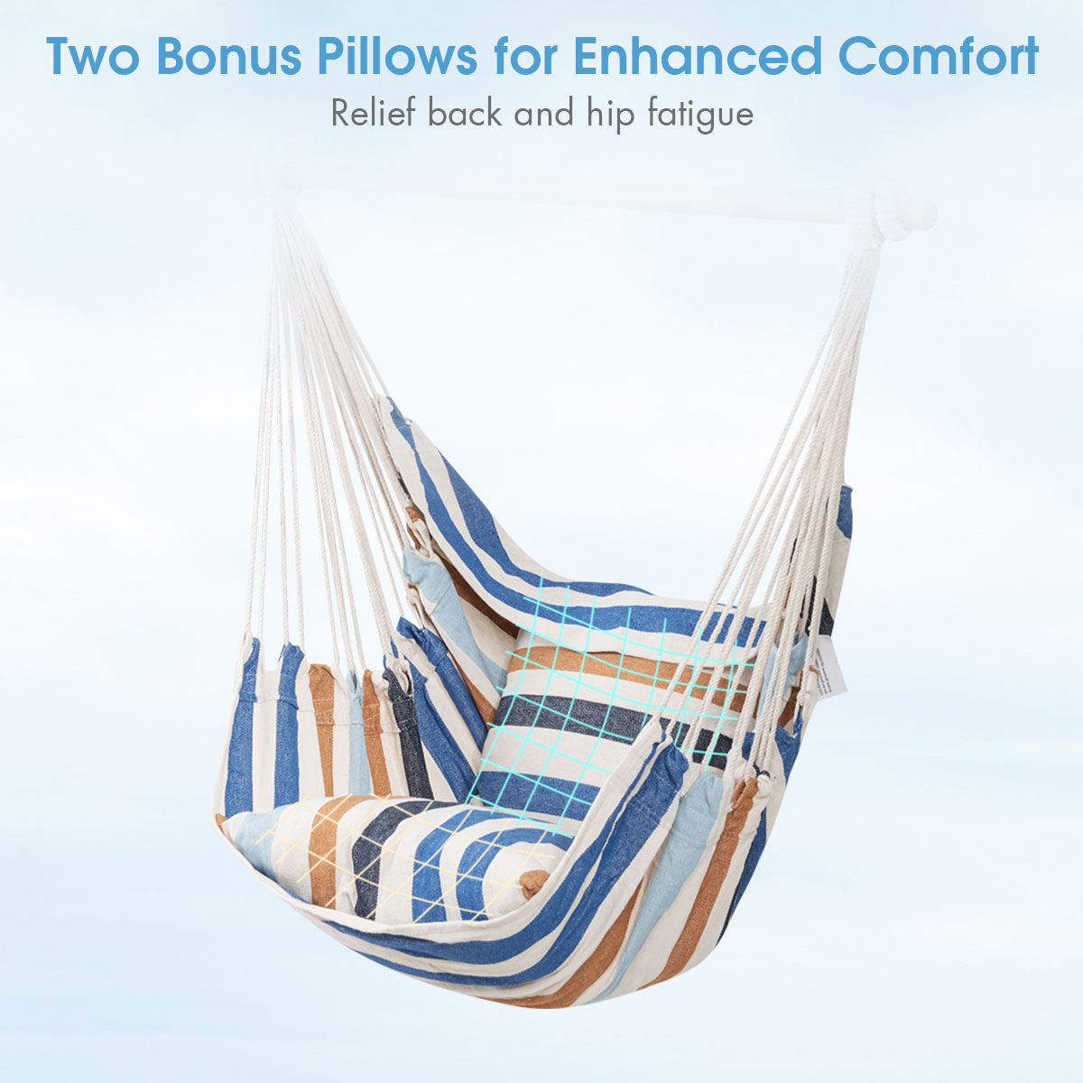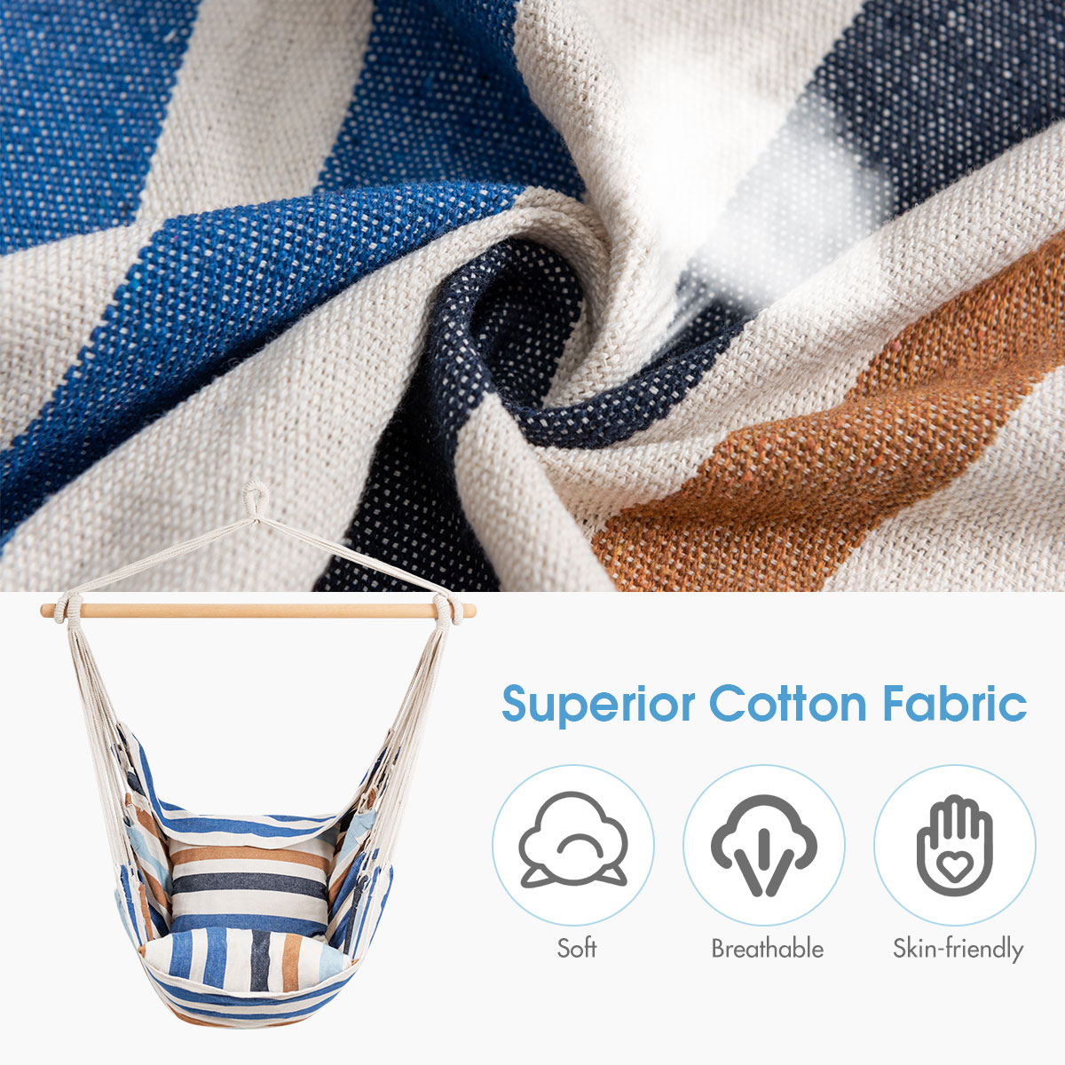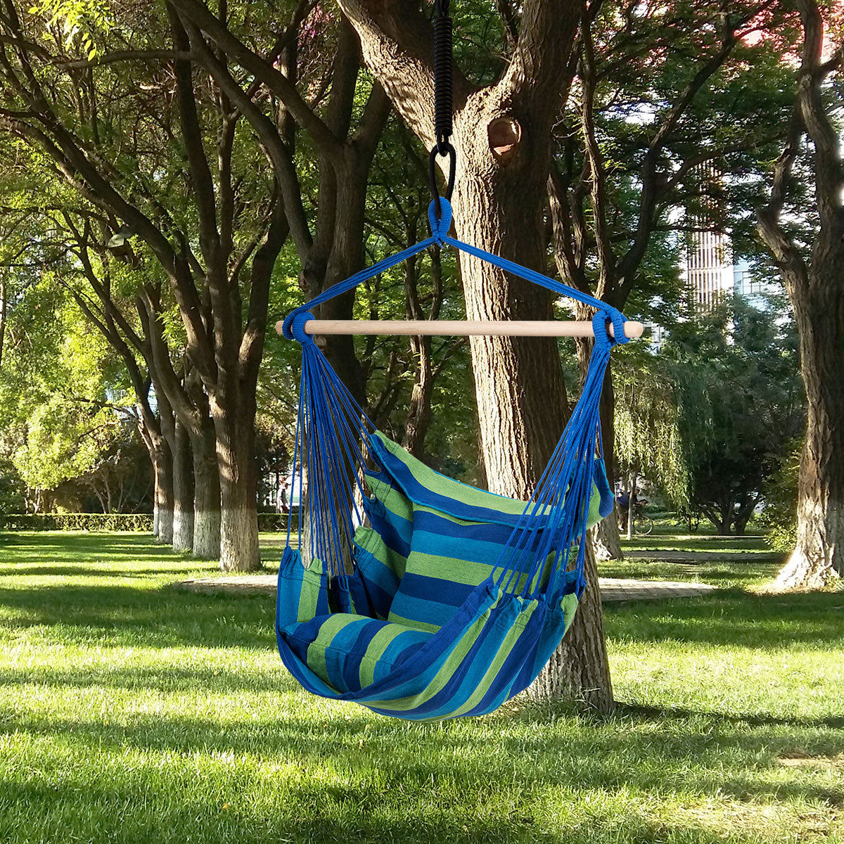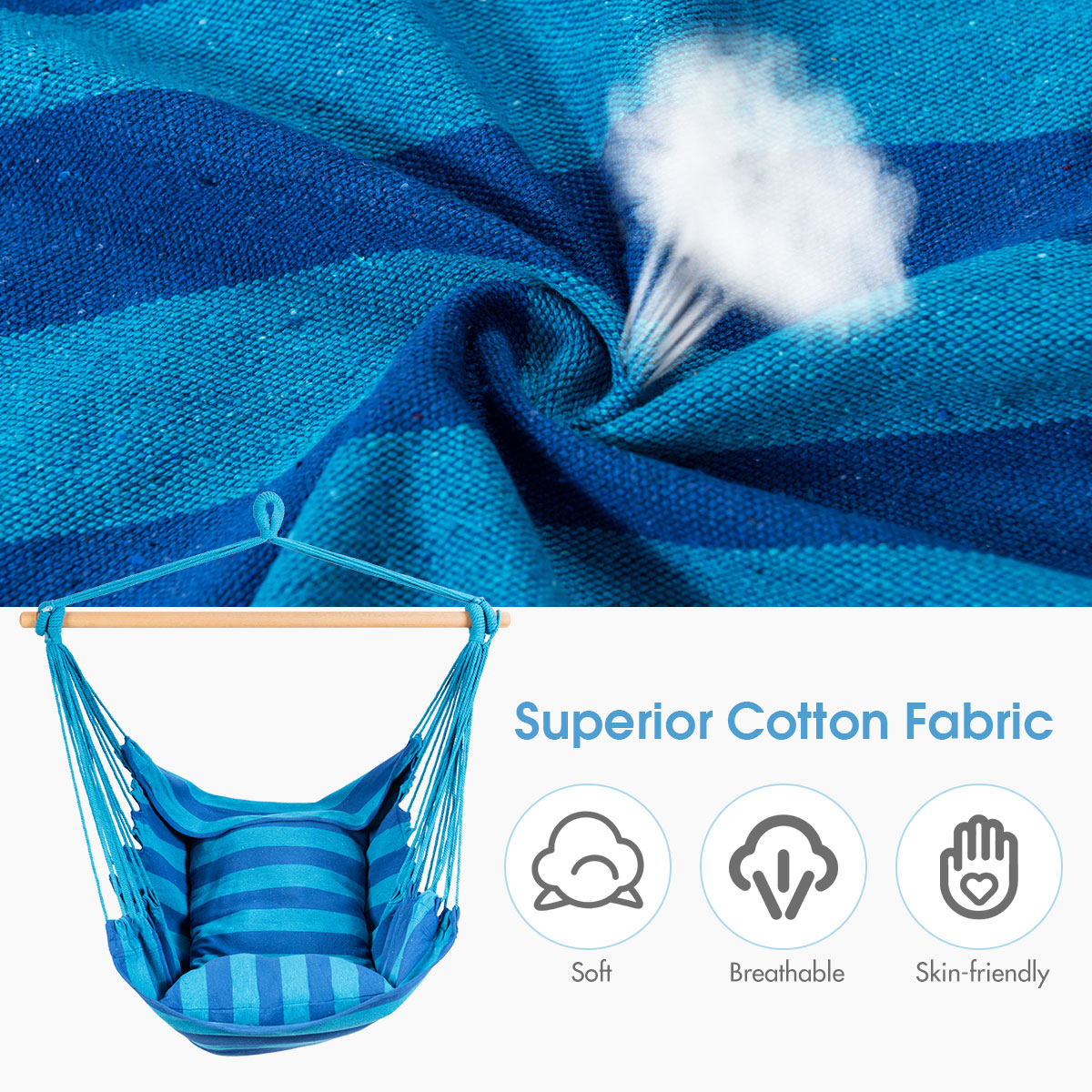 Soft Touch Fabric & Seat Cushions: Our hanging swing chair is tightly woven with comfortable and long-lasting colorfast cotton thread that gives users a euphoric feeling of laying on a soft sponge. High quality construction ensures this hammock chair will never tear or break with regular use. Besides, two soft cushions are provided for enhanced comfort.