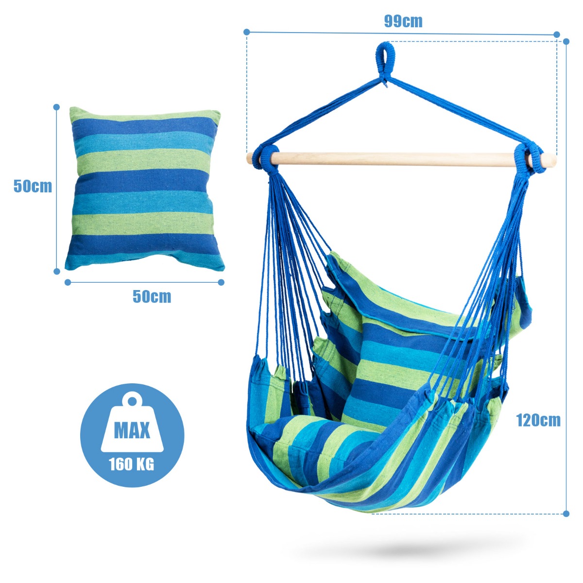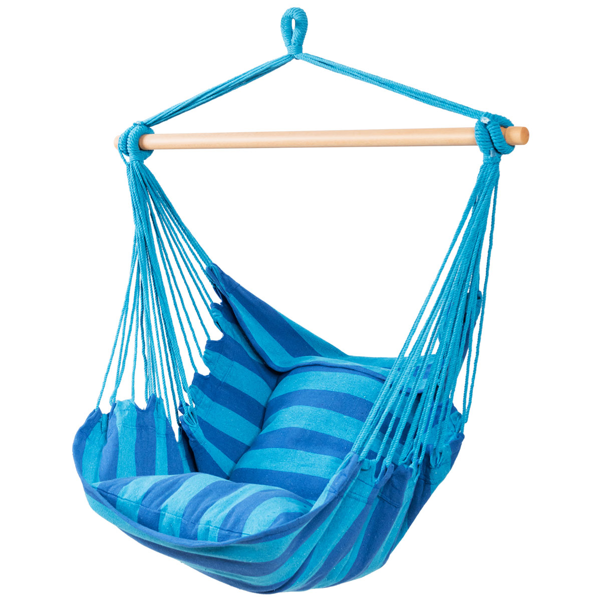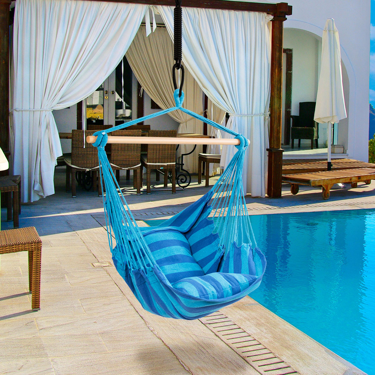 Wide Application: This hammock chair with cushions is uniquely designed and will be perfect for relaxing in your patio, yard, garden or deck. You won't feel tired for no matter how long you sit in it. In this way, you can meditate or take a nap comfortably. Moreover, its vibrant color will also add special charm to your home.