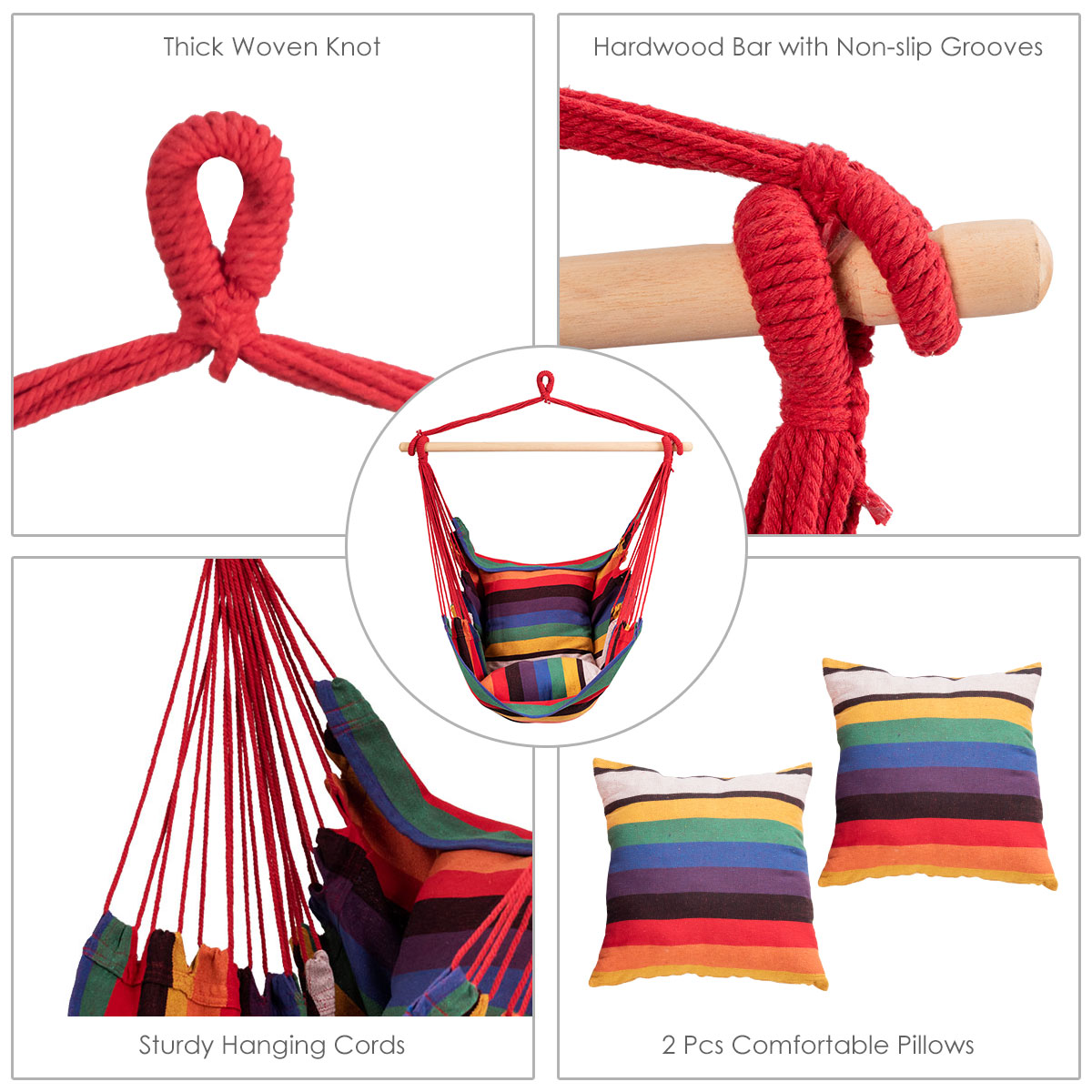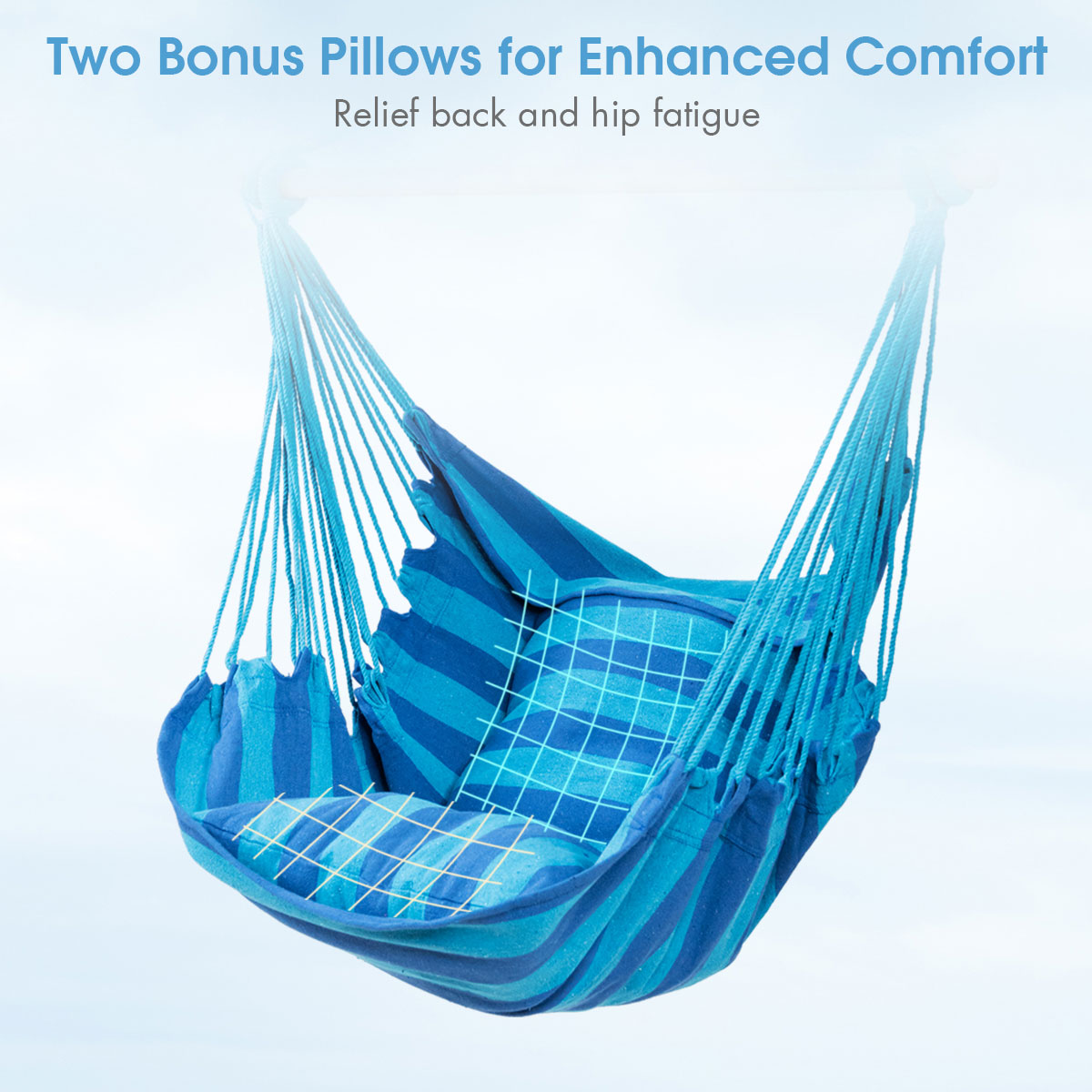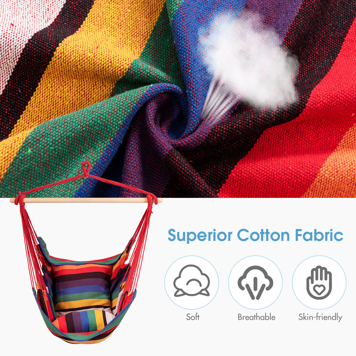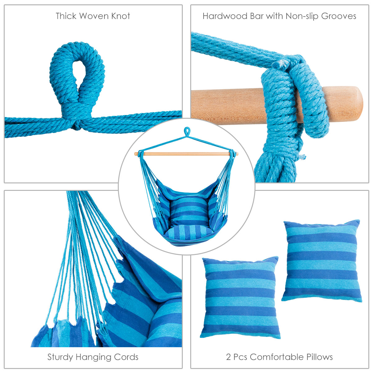 Swing in style and comfort with our portable indoor and outdoor hammock chair. This comfortable and trendy hammock swing is tightly woven with durable cotton thread for long term use. 26 hanging cords on each side of the chair will distribute weight, thus ensuring safe sitting experience. Besides, this hammock swing is paired with back support and two seat cushions for extra comfort. Featuring a thick woven knot on the top of the chair, this hanging rope swing seat can be hung anywhere indoors or outdoors and hold up to 350 lbs. With its vibrant color, it will add special charm to any indoor or outdoor space. Hang it in the yard and enjoy your leisure time swinging with dreamy feeling of weightlessness.