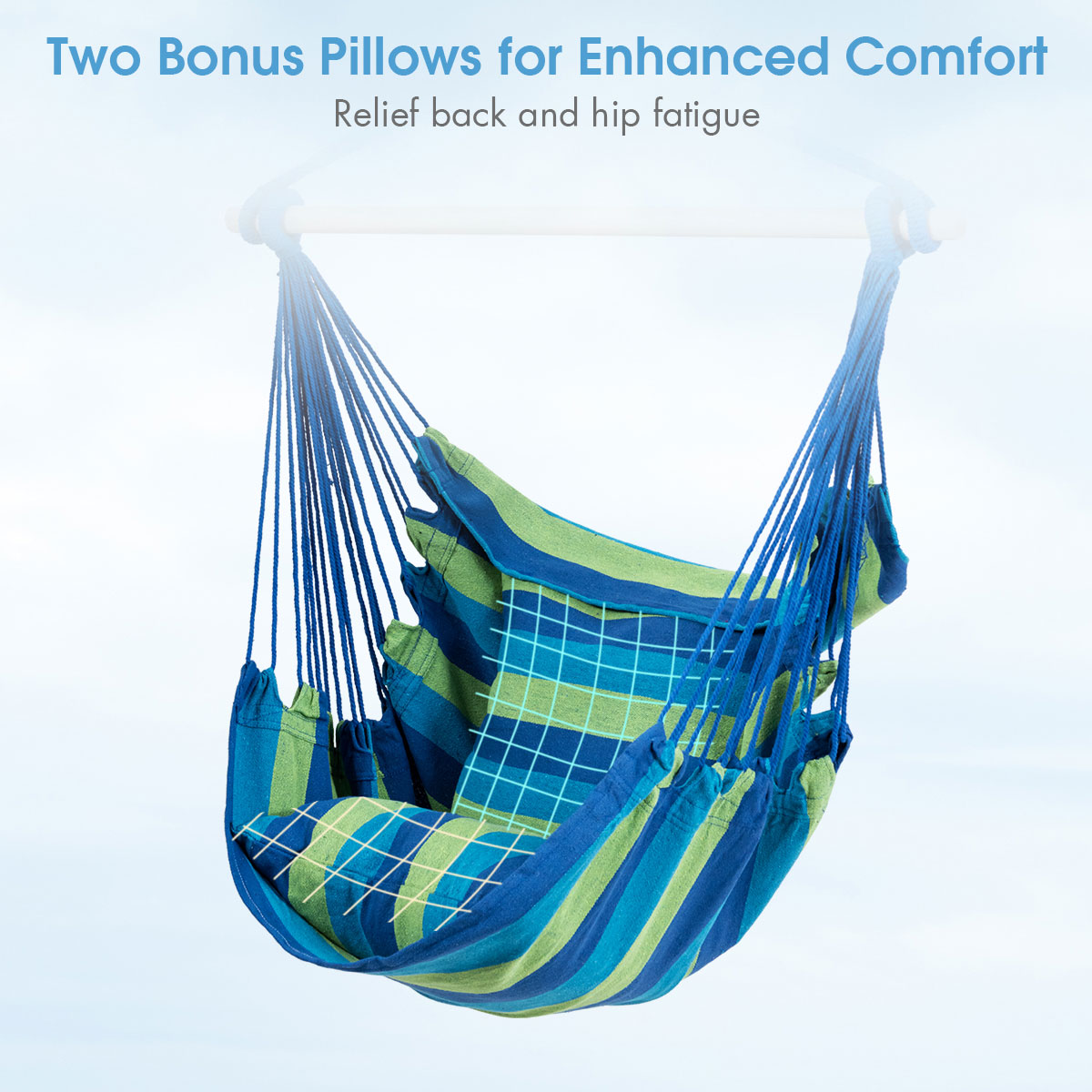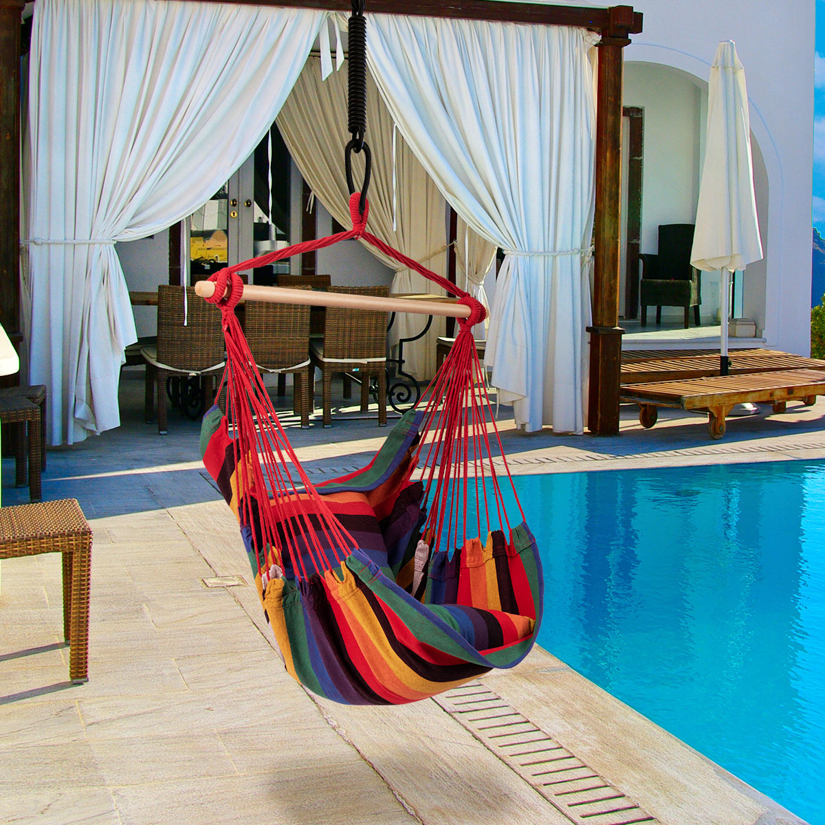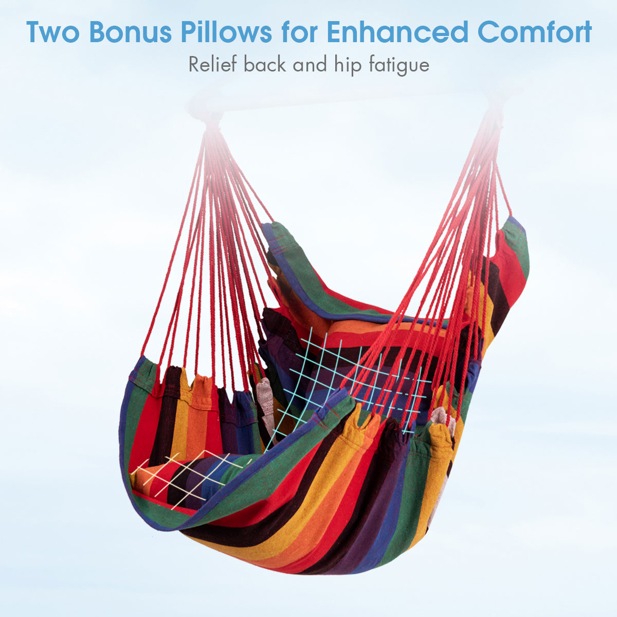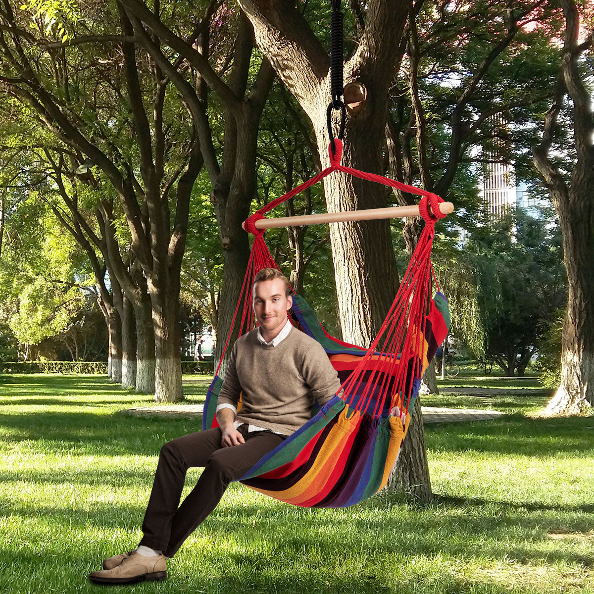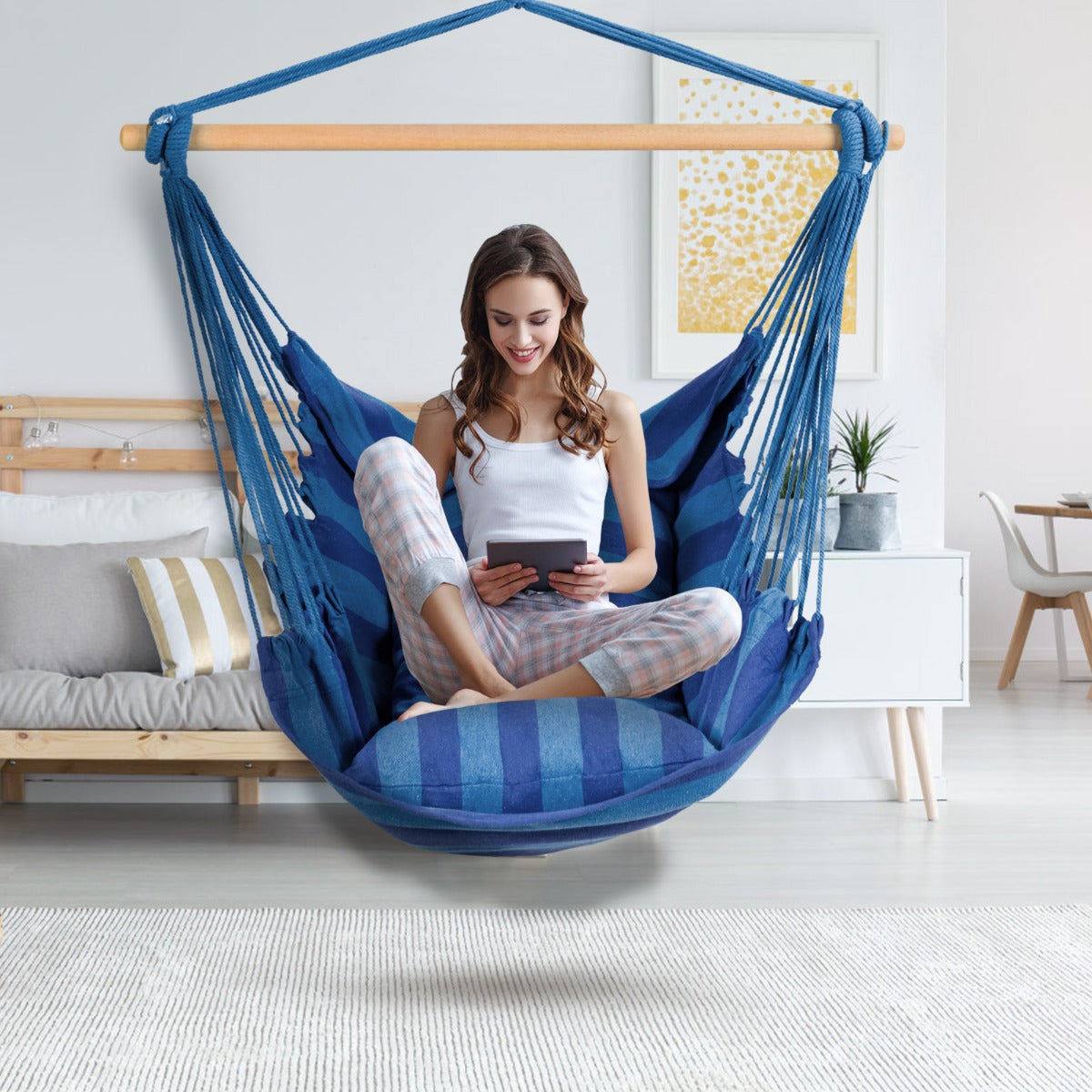Swing in style and comfort with our portable indoor and outdoor hammock chair. This comfortable and trendy hammock swing is tightly woven with durable cotton thread for long term use. 26 hanging cords on each side of the chair will distribute weight, thus ensuring safe sitting experience. Besides, this hammock swing is paired with back support and two seat cushions for extra comfort. Featuring a thick woven knot on the top of the chair, this hanging rope swing seat can be hung anywhere indoors or outdoors and hold up to 350 lbs. With its vibrant color, it will add special charm to any indoor or outdoor space. Hang it in the yard and enjoy your leisure time swinging with dreamy feeling of weightlessness.