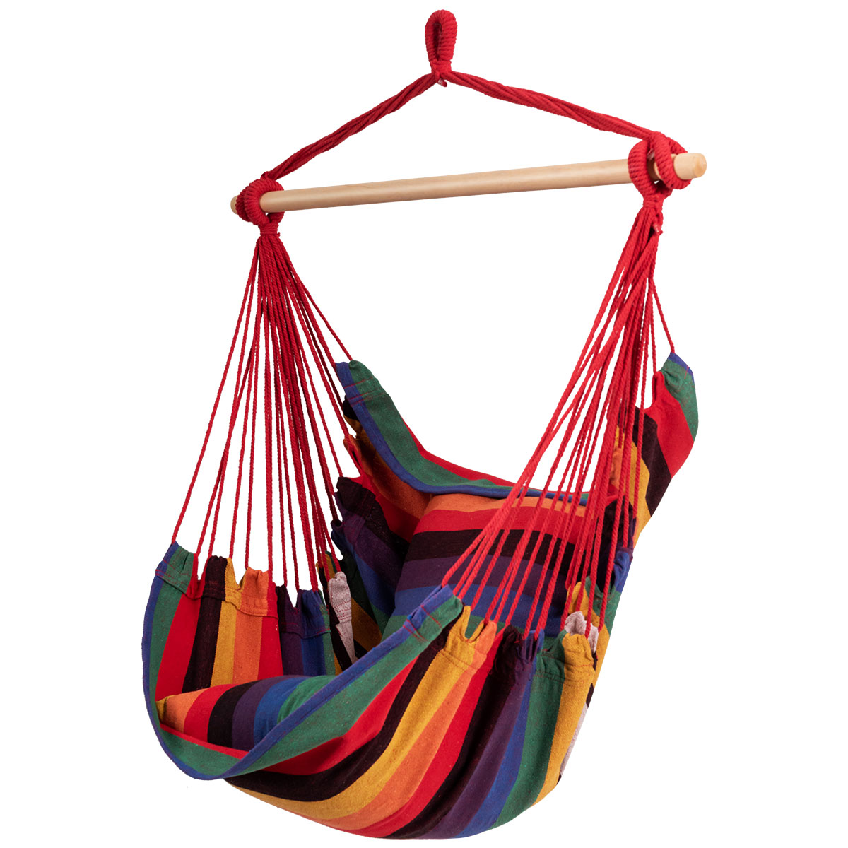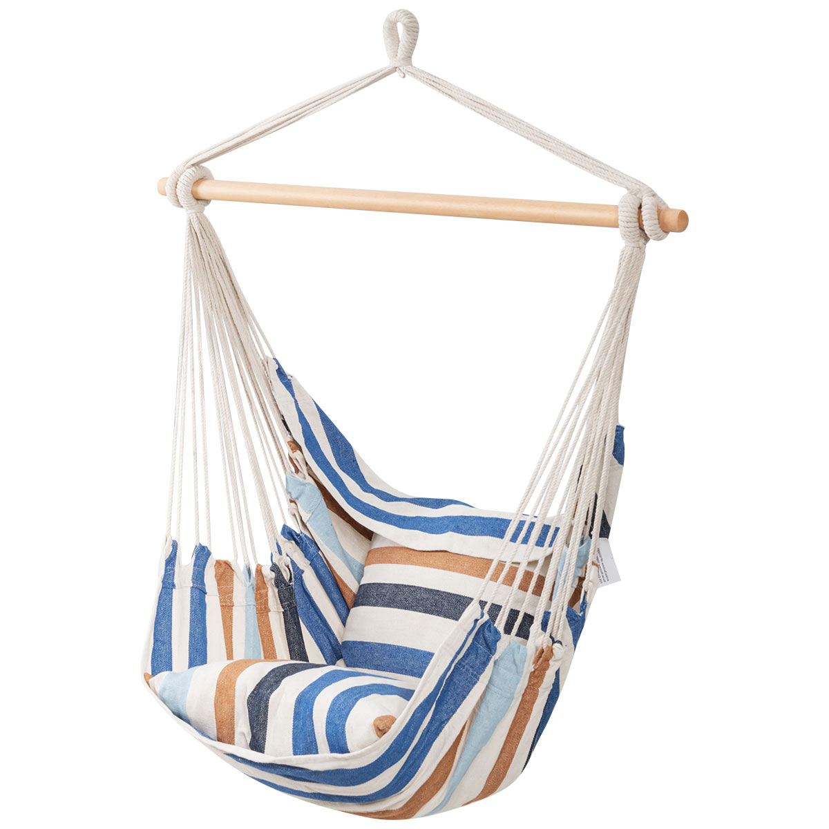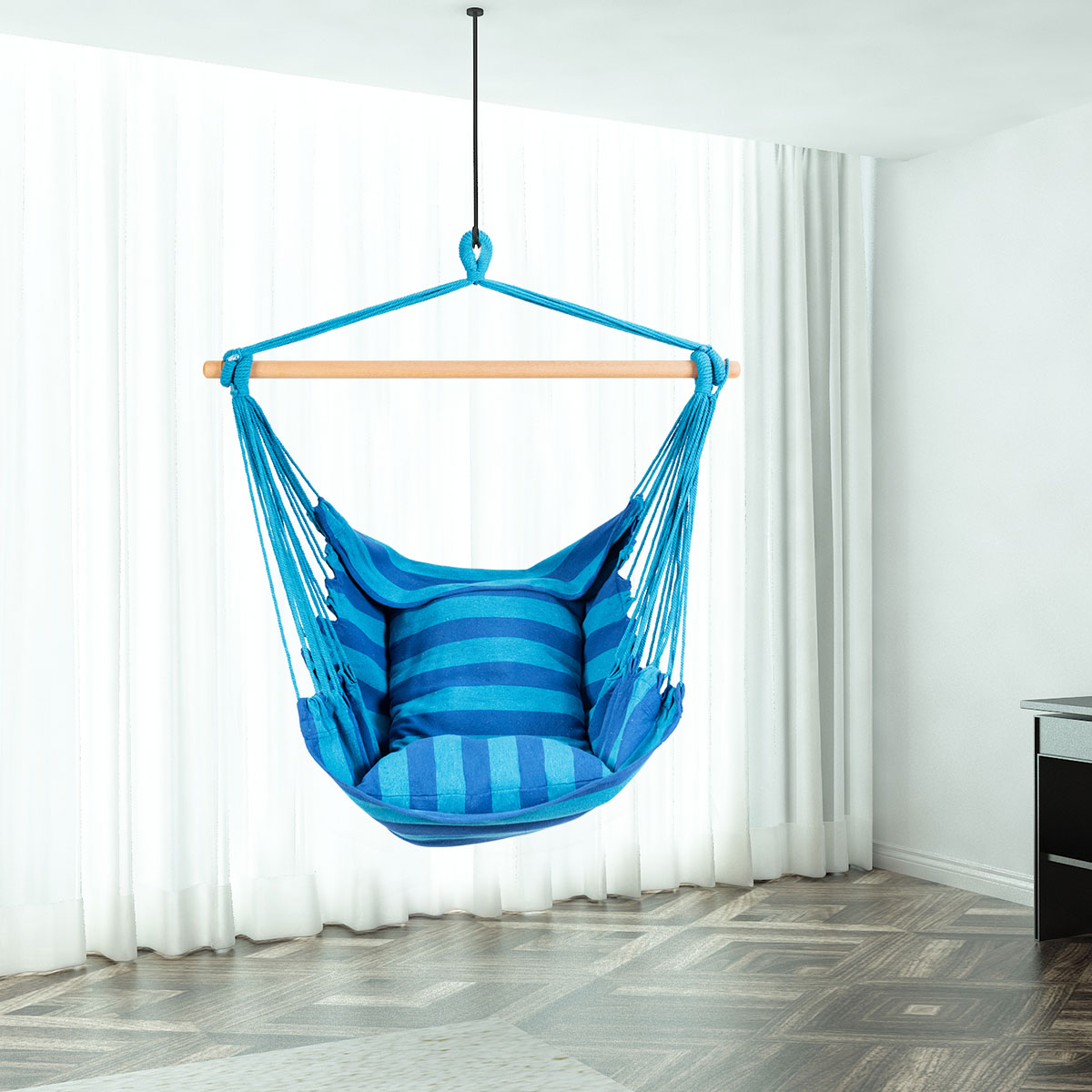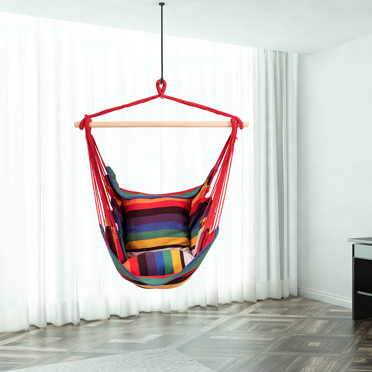 Swing in style and comfort with our portable indoor and outdoor hammock chair. This comfortable and trendy hammock swing is tightly woven with durable cotton thread for long term use. 26 hanging cords on each side of the chair will distribute weight, thus ensuring safe sitting experience. Besides, this hammock swing is paired with back support and two seat cushions for extra comfort. Featuring a thick woven knot on the top of the chair, this hanging rope swing seat can be hung anywhere indoors or outdoors and hold up to 350 lbs. With its vibrant color, it will add special charm to any indoor or outdoor space. Hang it in the yard and enjoy your leisure time swinging with dreamy feeling of weightlessness.