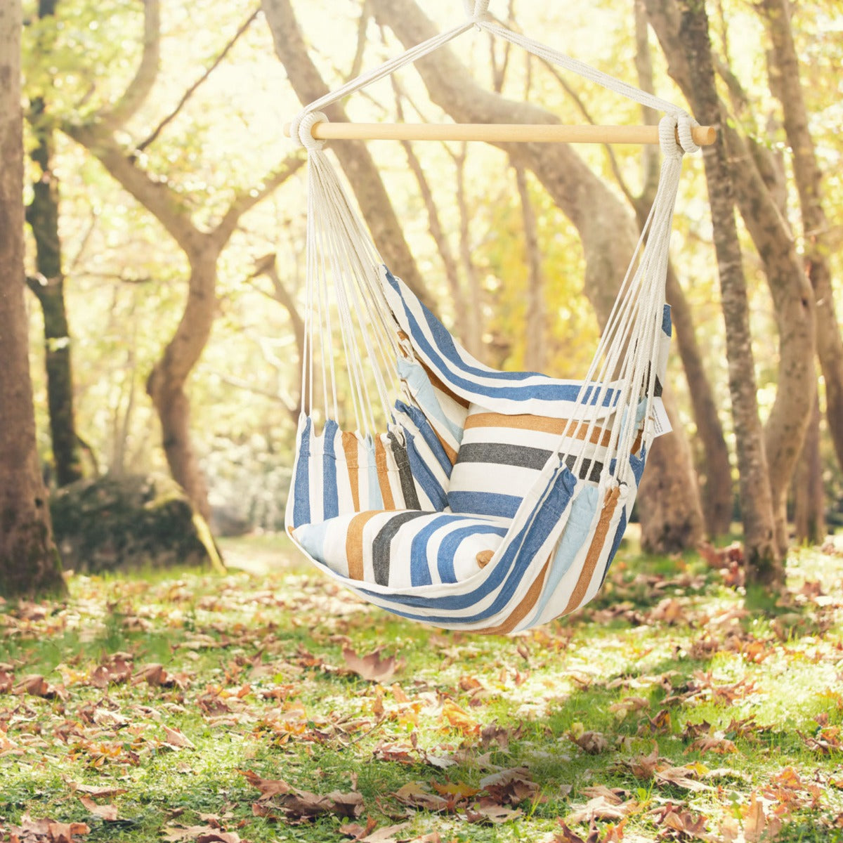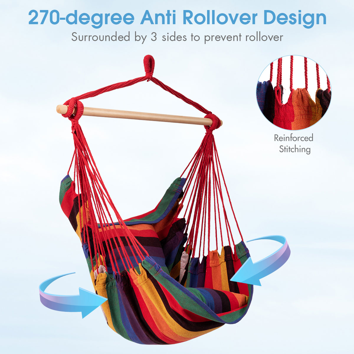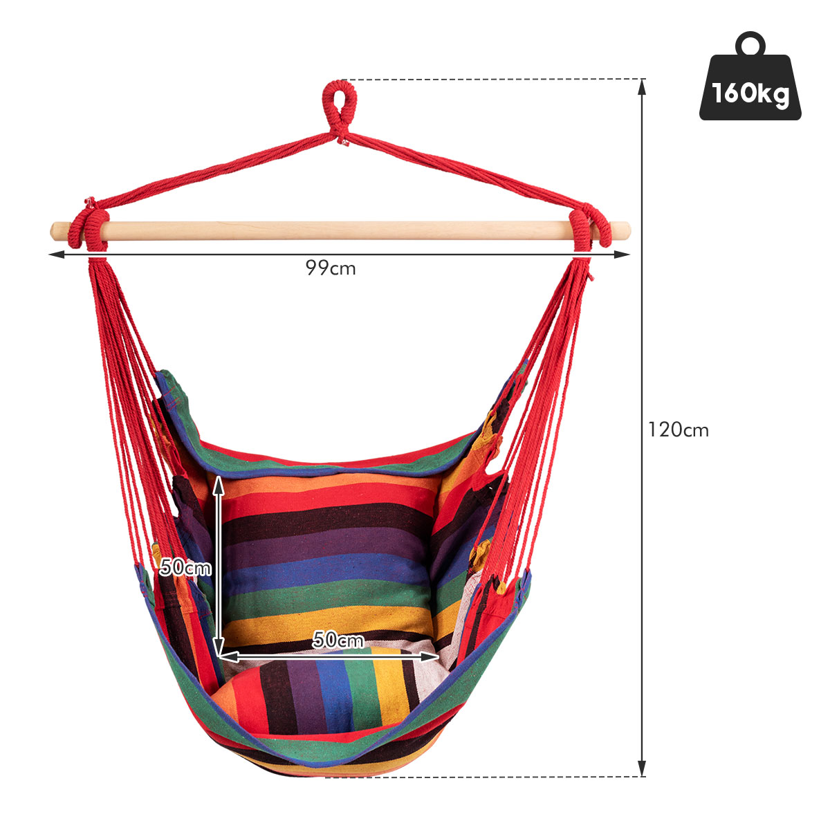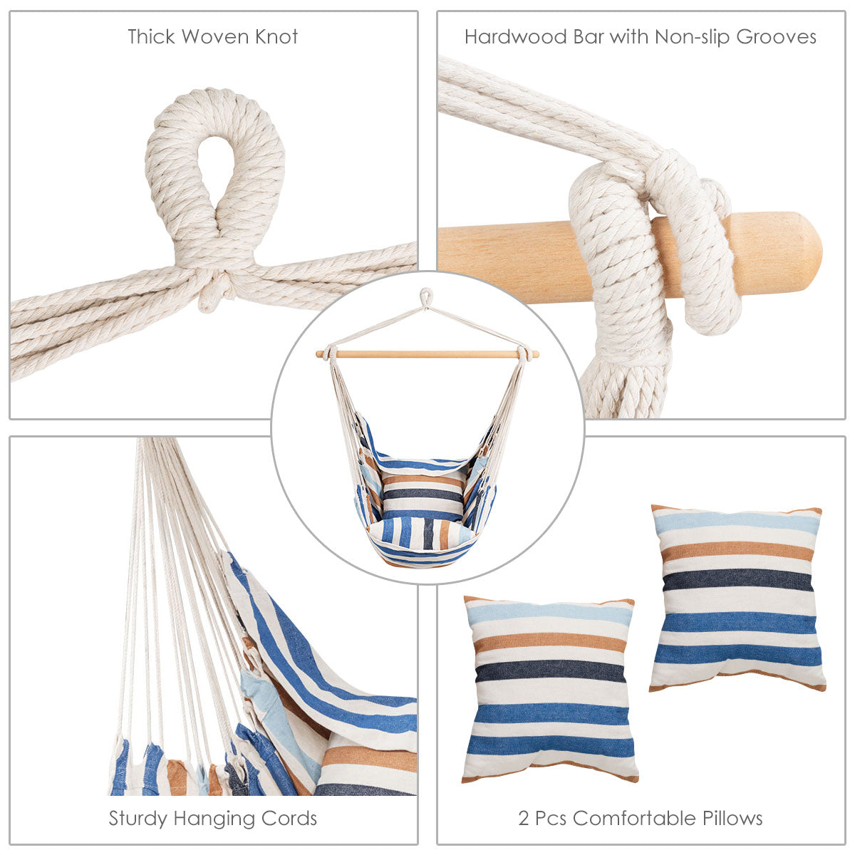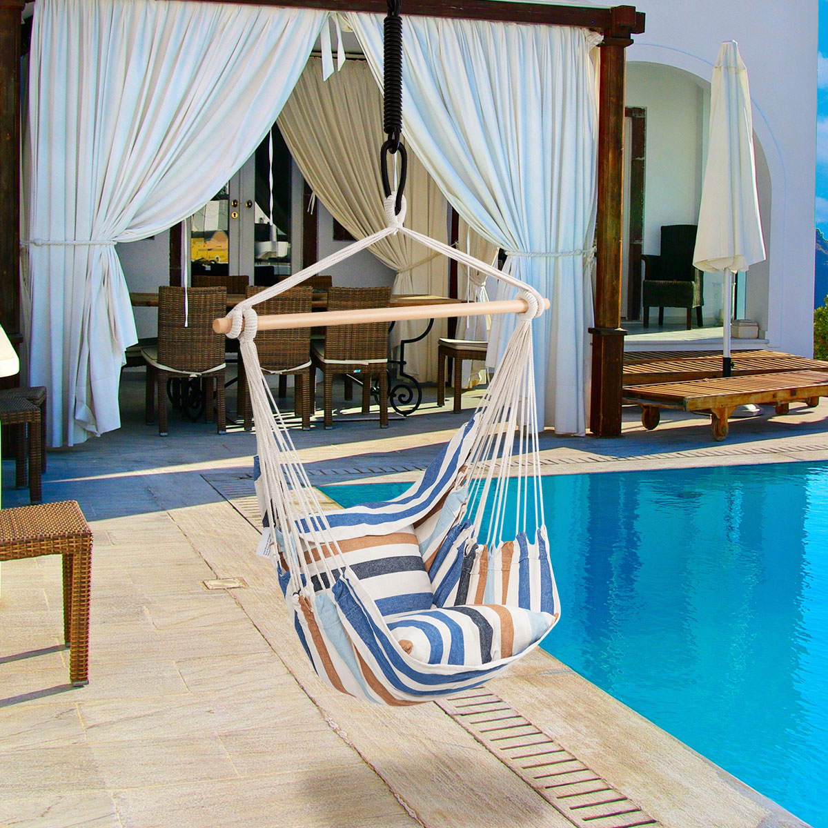 Swing in style and comfort with our portable indoor and outdoor hammock chair. This comfortable and trendy hammock swing is tightly woven with durable cotton thread for long term use. 26 hanging cords on each side of the chair will distribute weight, thus ensuring safe sitting experience. Besides, this hammock swing is paired with back support and two seat cushions for extra comfort. Featuring a thick woven knot on the top of the chair, this hanging rope swing seat can be hung anywhere indoors or outdoors and hold up to 350 lbs. With its vibrant color, it will add special charm to any indoor or outdoor space. Hang it in the yard and enjoy your leisure time swinging with dreamy feeling of weightlessness.