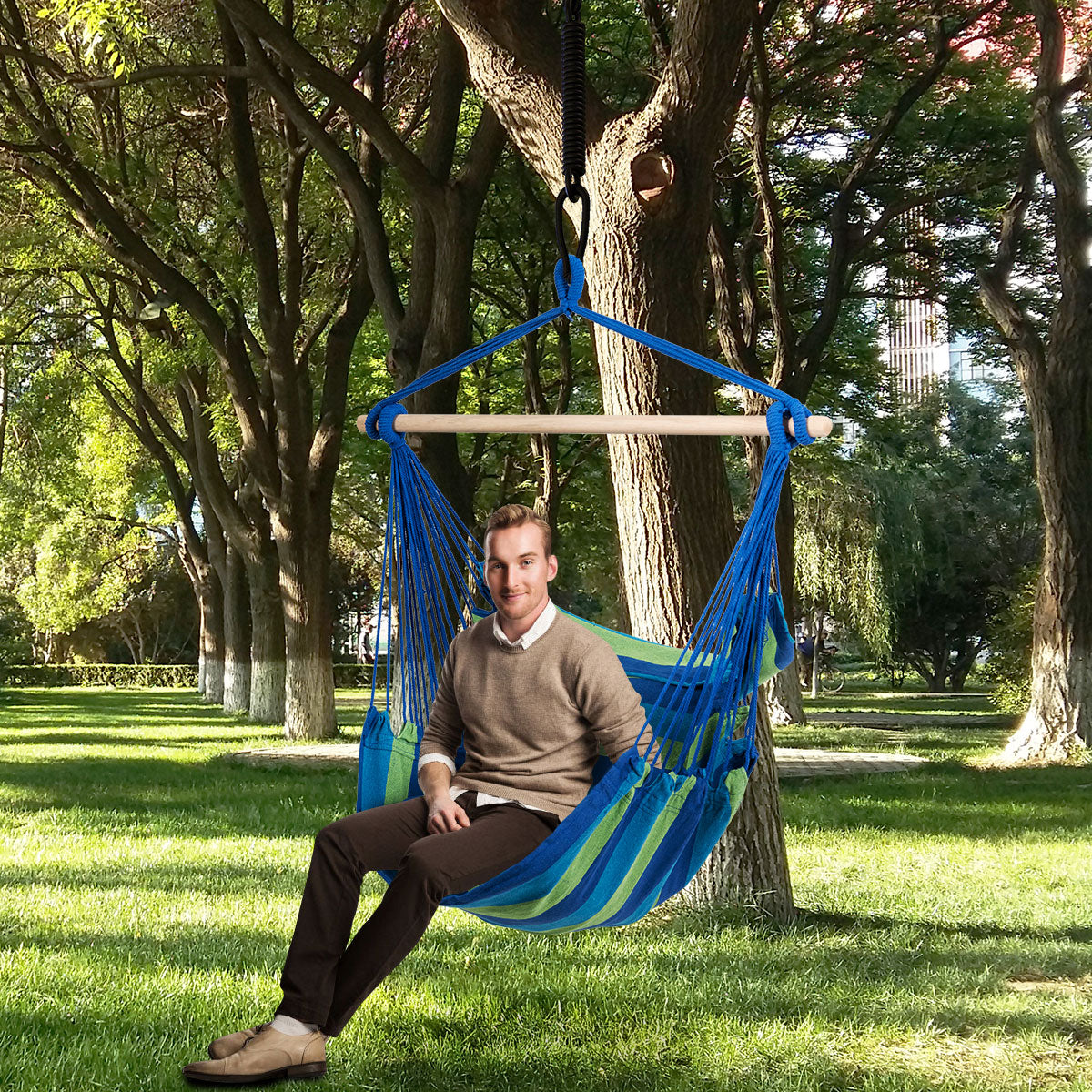 Strong Construction: This hammock chair boasts a load capacity of 350 lbs and is built for durability by combining solid wood bar with sturdy hanging cords. There are two grooves at the ends of the wood bar to catch the rope and prevent slipping. 26 hanging cords on each side of the chair will distribute weight and help keep balance.