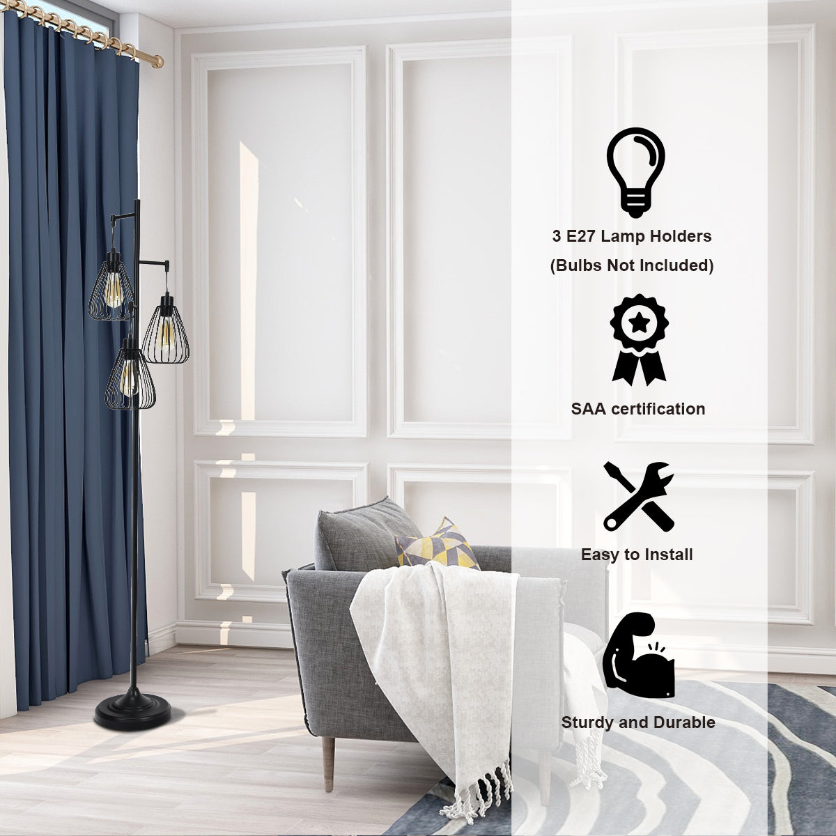 Bright Light & Warm Ambiance: Our floor lamps are designed with 3 E26 lamp holders (bulbs are not included) and can support bulbs with a maximum power of 60W. At night, our standing lamps will provide you with bright light and create a warm atmosphere for you.