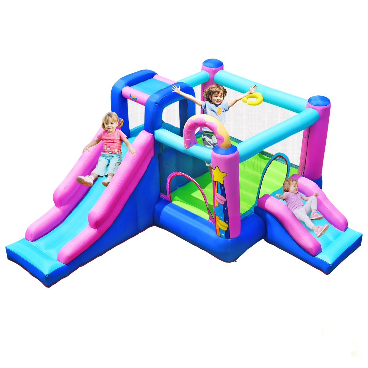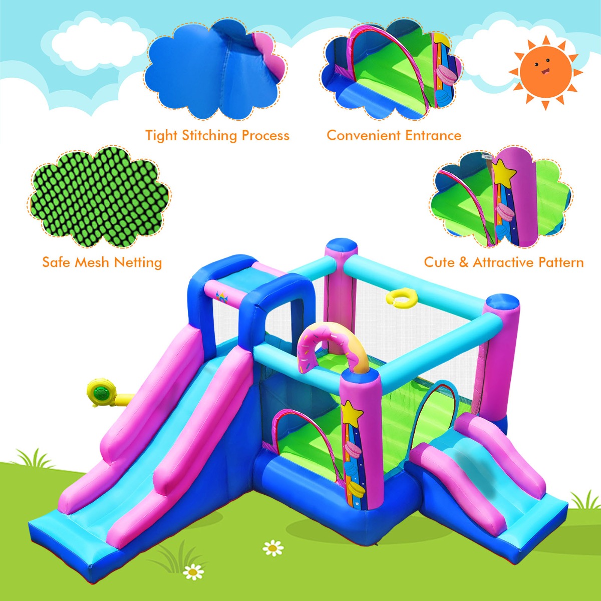 Multiple Play Areas for Extra Fun: This inflatable bounce house comes with 2 slides, a climbing wall, a large jumping area and a basketball rim, which provides children with multiple ways of entertainment. Cute appearance and bright colors attract children to enjoy endless of happiness and fun.