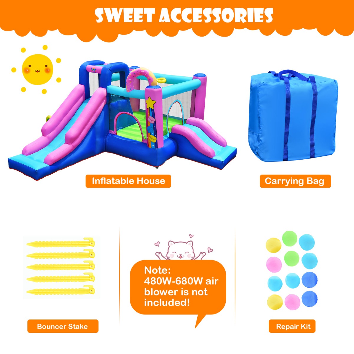 Sweet Accessory: The package includes all required accessories and well-illustrated instructions. A carrying bag for easy transportation and storage, 5 bouncer stakes to fix the inflatable bounce castle for super stability and maximum security. And 12 repair patches for convenient maintenance.
