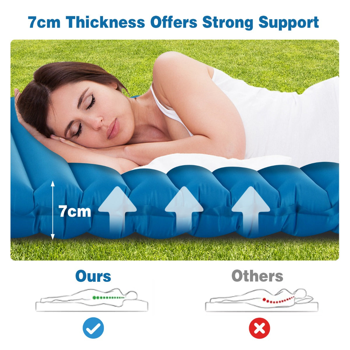Comfortable Sleeping Experience: With 7 cm thickness, the camping air keeps you away from rugged and cold ground mattresses while eliminating heat loss. Moreover, the fully inflated mattress offers strong support and load capacity of up to 100 kg, ensuring that you can sleep soundly regardless of any sleeping position.
