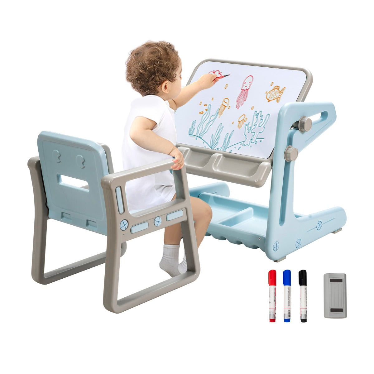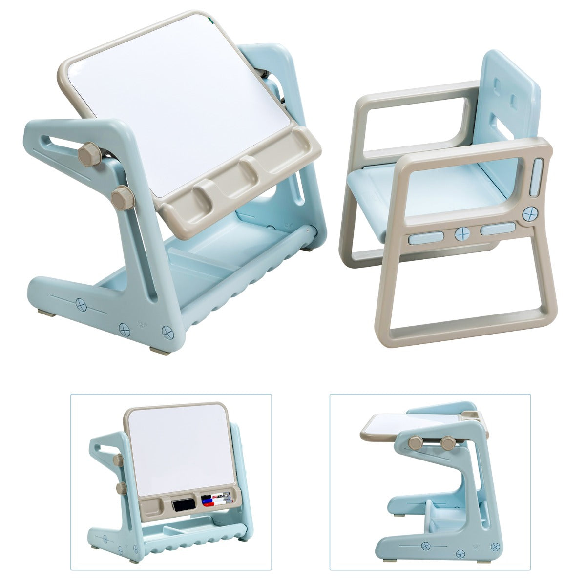 This 2-in-1 kid painting board with the chair set can not only be used as a table, but you can also adjust the angle to make it a drawing board. Both the tabletop and the bottom of the table feature slots, providing enough space for your child to store whiteboard pen, eraser, toys and other sundries. The odorless HDPE material and rounded corners are designed to protect your child's safety. The comfortable backrest provides support for the child's body. Foot pads are dedicated to effectively preventing the floor from being scratched. The table can be installed in a few simple steps, saving you time and energy.