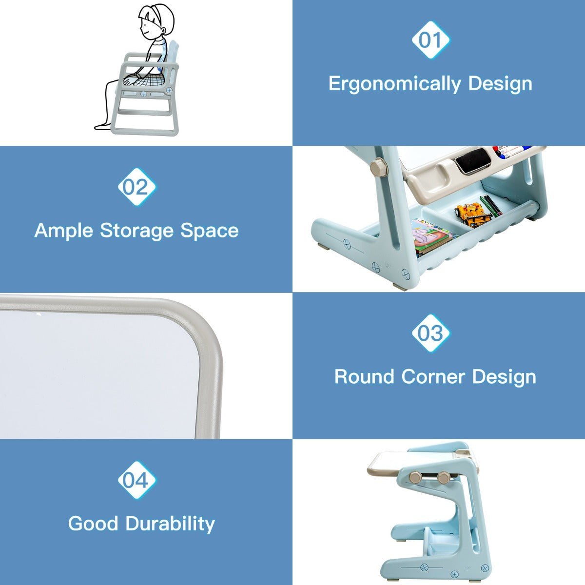 Premium Material and Rounded Corner: Made of odorless HDPE material, this multifunctional kid drawing board with chair can be absolutely safe to use. What's more, the rounded corner design of the children's painting board and the armrest of the chair can effectively protect children from scratches and falls.
