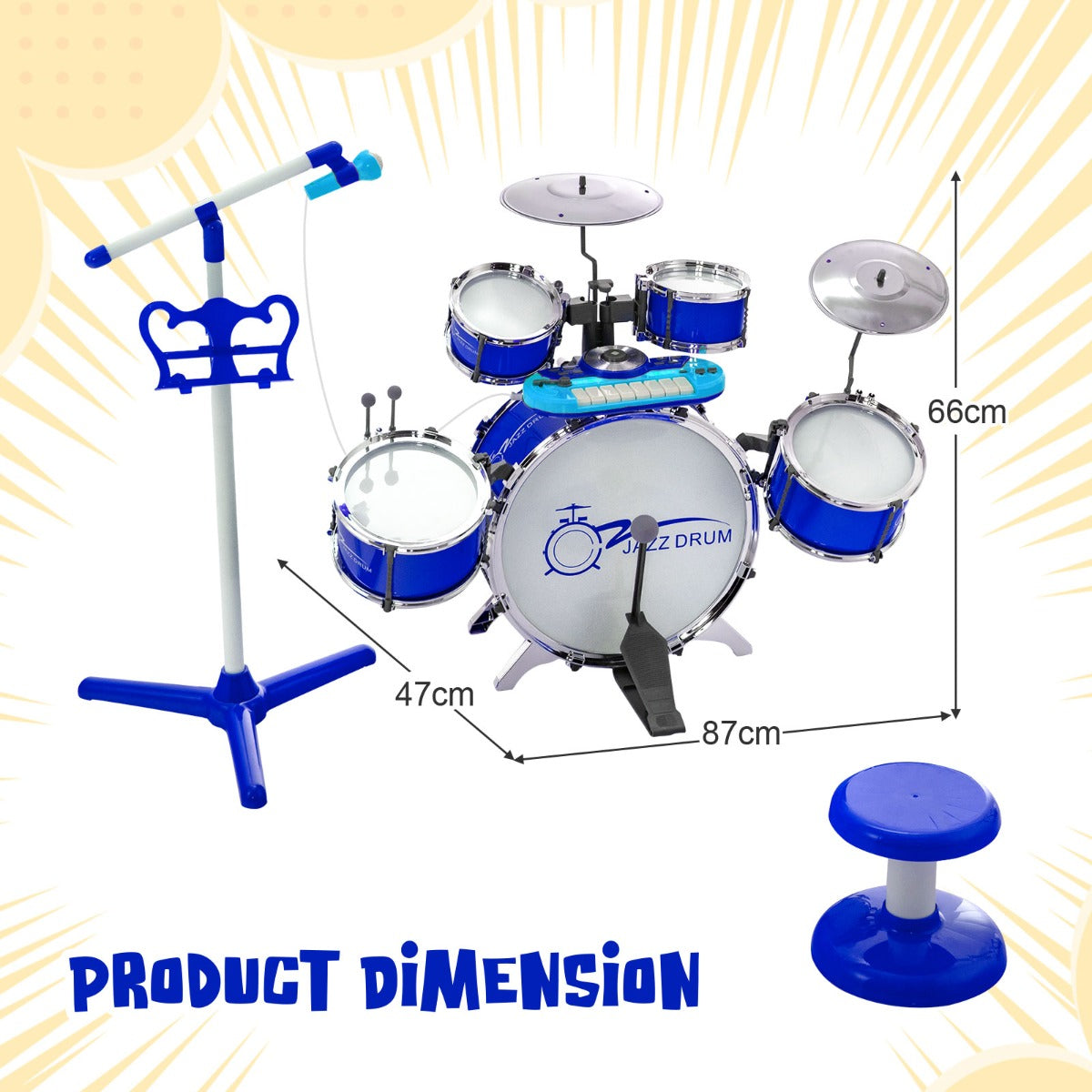 Complete All-in-One Drum Kit: This musical instrument set is composed of a jazz drum set, an 8-key electric keyboard, a microphone stand and a round stool, providing kids with a comfortable and complete rock and roll area for recreation. Besides, 2 drum sticks are also included, and drum stick holders are designed for convenient storage.