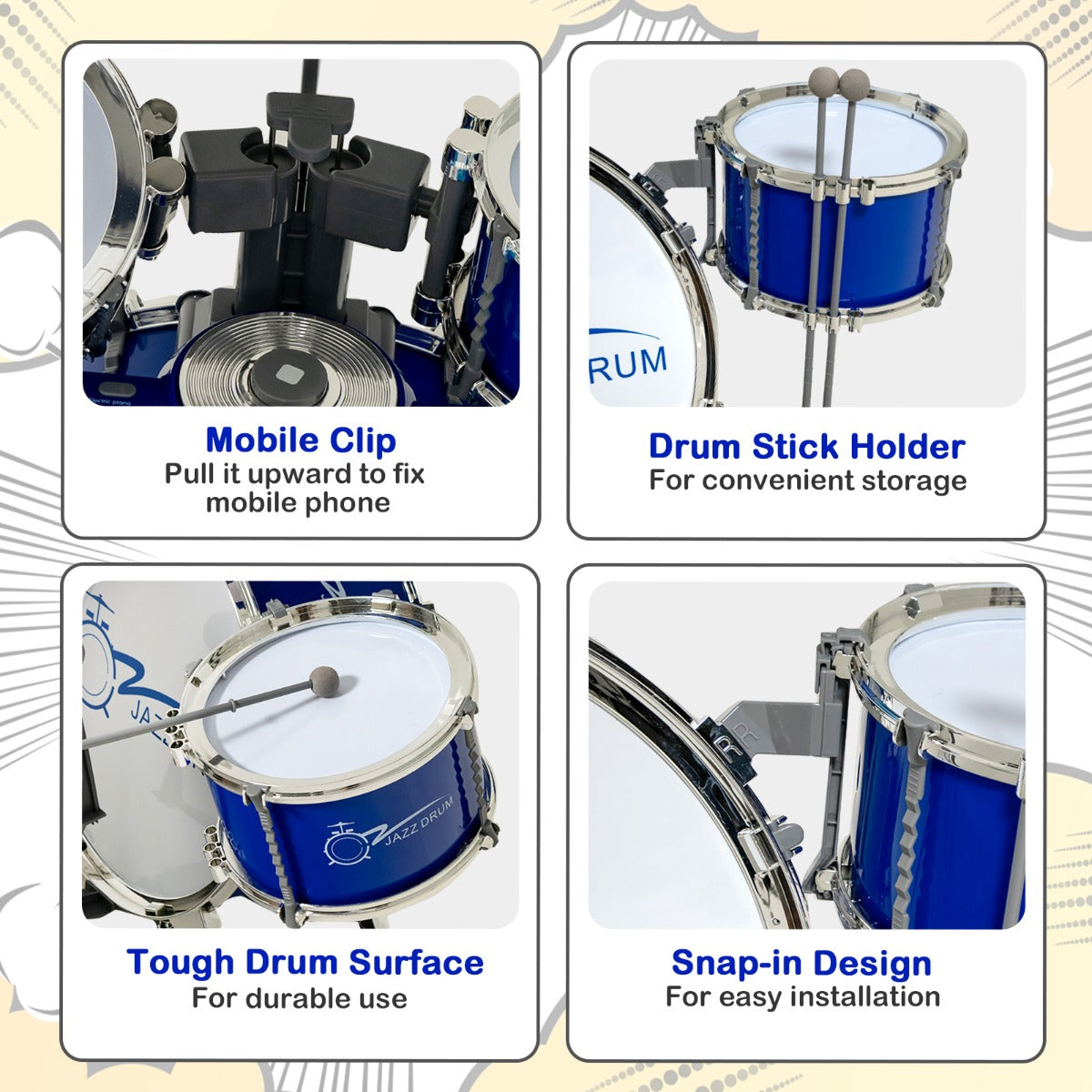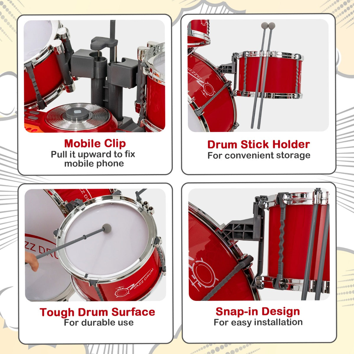 Stable Structure & Safe Material: Mainly made of well-selected ABS material, this jazz drum instrument set is safe for kids to use. The sturdy drum support legs and triangular microphone stand base offer outstanding stability to withstand kids' hard striking. Also, the tough drum surface is designed for durable use.