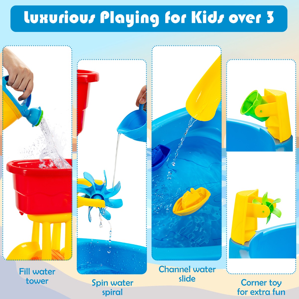2-In-1 Activity Table: This beach table playset features 2 playing sections. Fill it with water, sand, pea shingle to create a versatile play station for your children. It is recommended for kids over 3 years old and an ideal gift to encourage them.