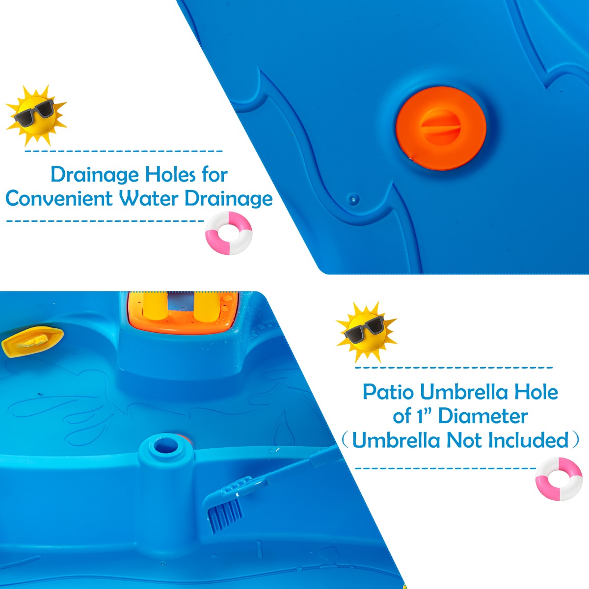 2-in-1 design with abundant accessory set, toddlers can extract unlimited fun from this playset. Featuring an umbrella hole, the playground reaches both indoors and outdoors. It is also an educational playset that is designed to enhance the abilities of children both mentally and socially. Crafted out of upgraded pp material, this table playset will give your kids a long and quality company. When playtime fun is done,you can use the drainage hole to clean-up water