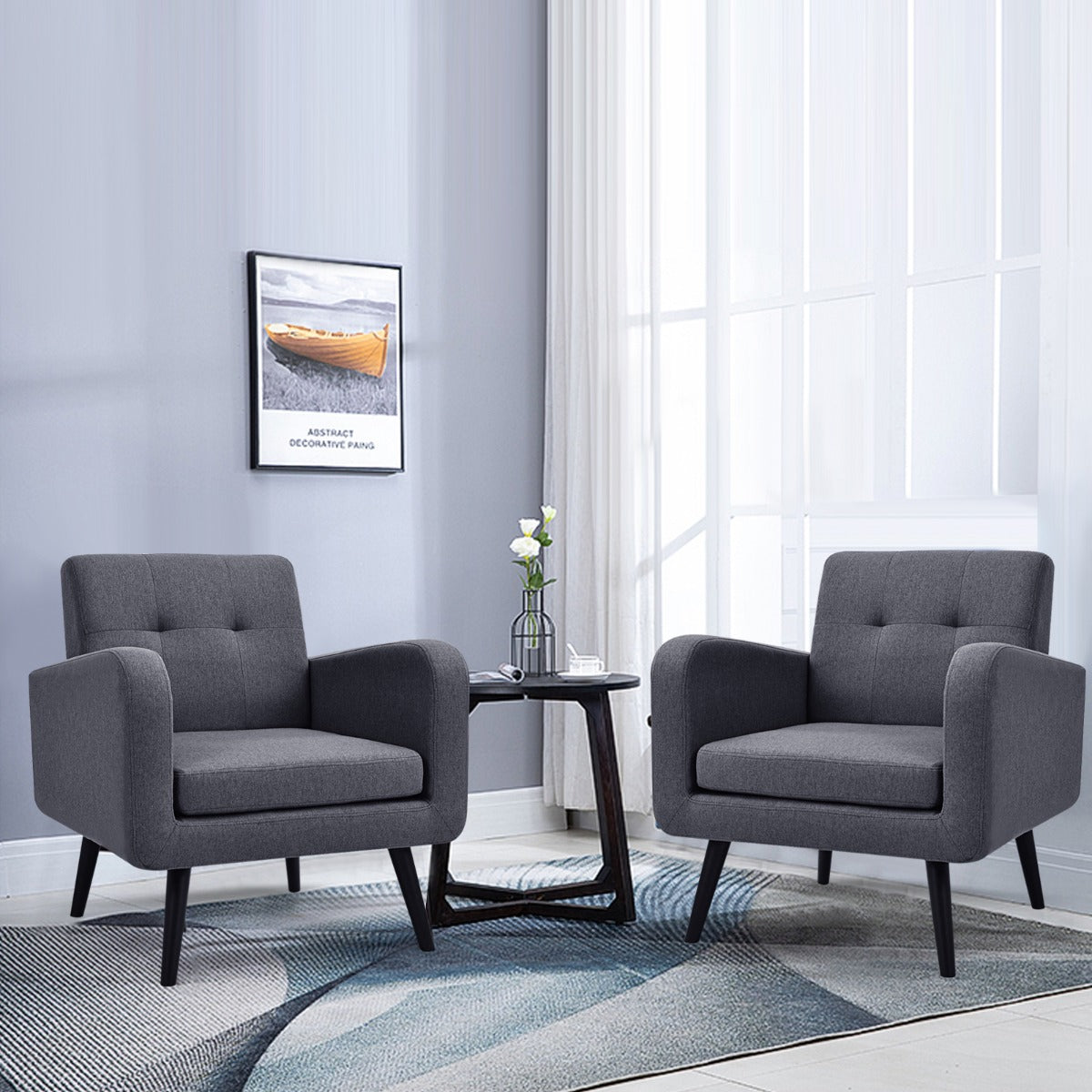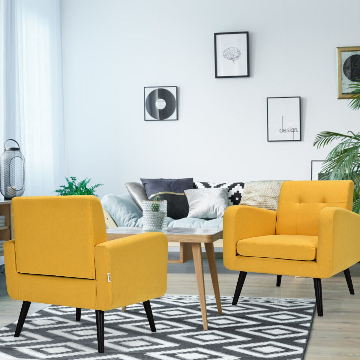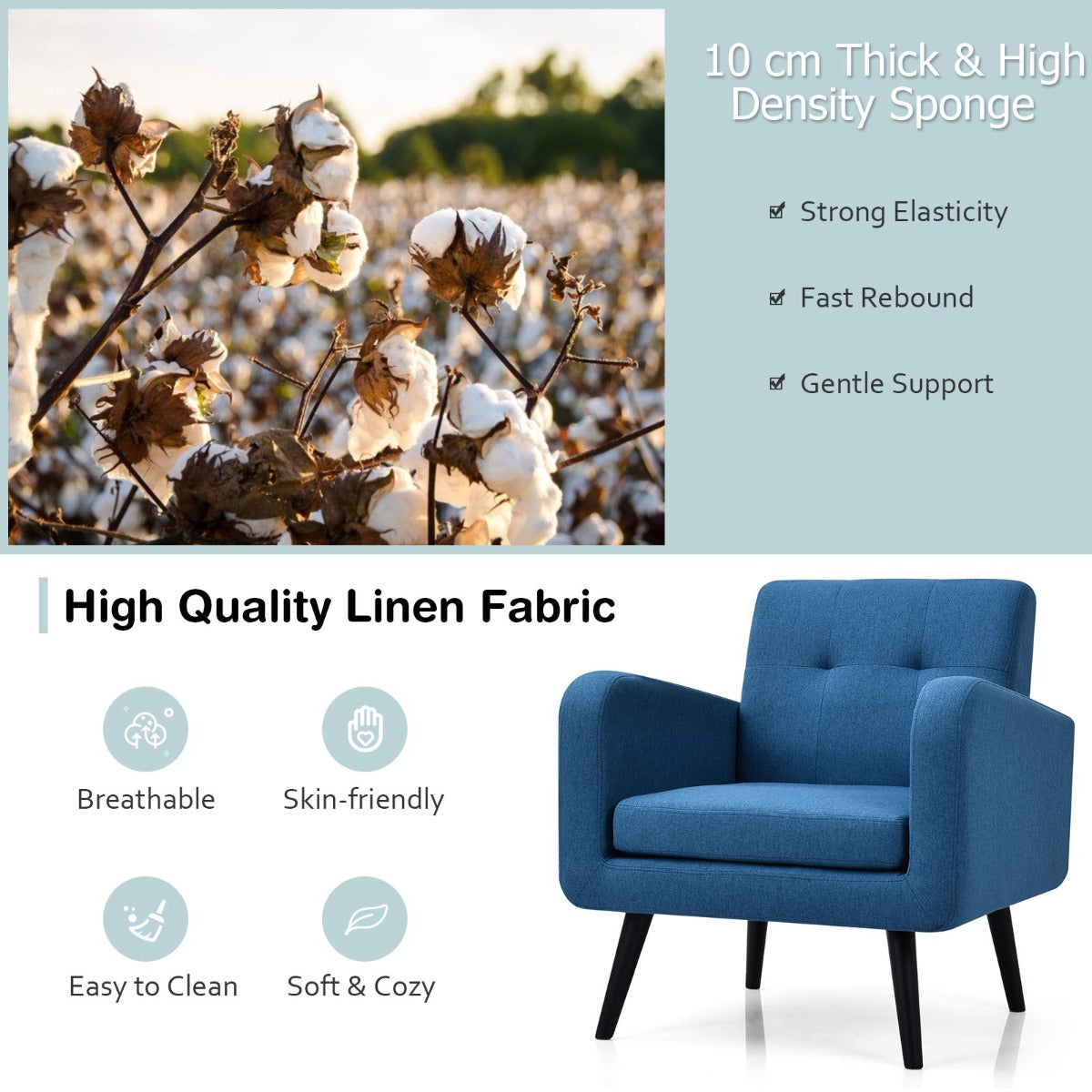 Supported by solid rubber wood legs, the armchair ensures good stability and strong bearing strength. Wide backrest and thick cushion are padded with highly elastic sponge for optimal softness. Moreover, fine linen cover is breathable and skin-friendly to offer you a comfortable sitting experience. Lean on the padded backrest, put your arm on the armrest and take a rest for a moment of physical relaxation. Elegant style with tufted back design creates an attractive look, which fits well with your personal taste and home decor. It is just what you need for your living room to receive your friends!