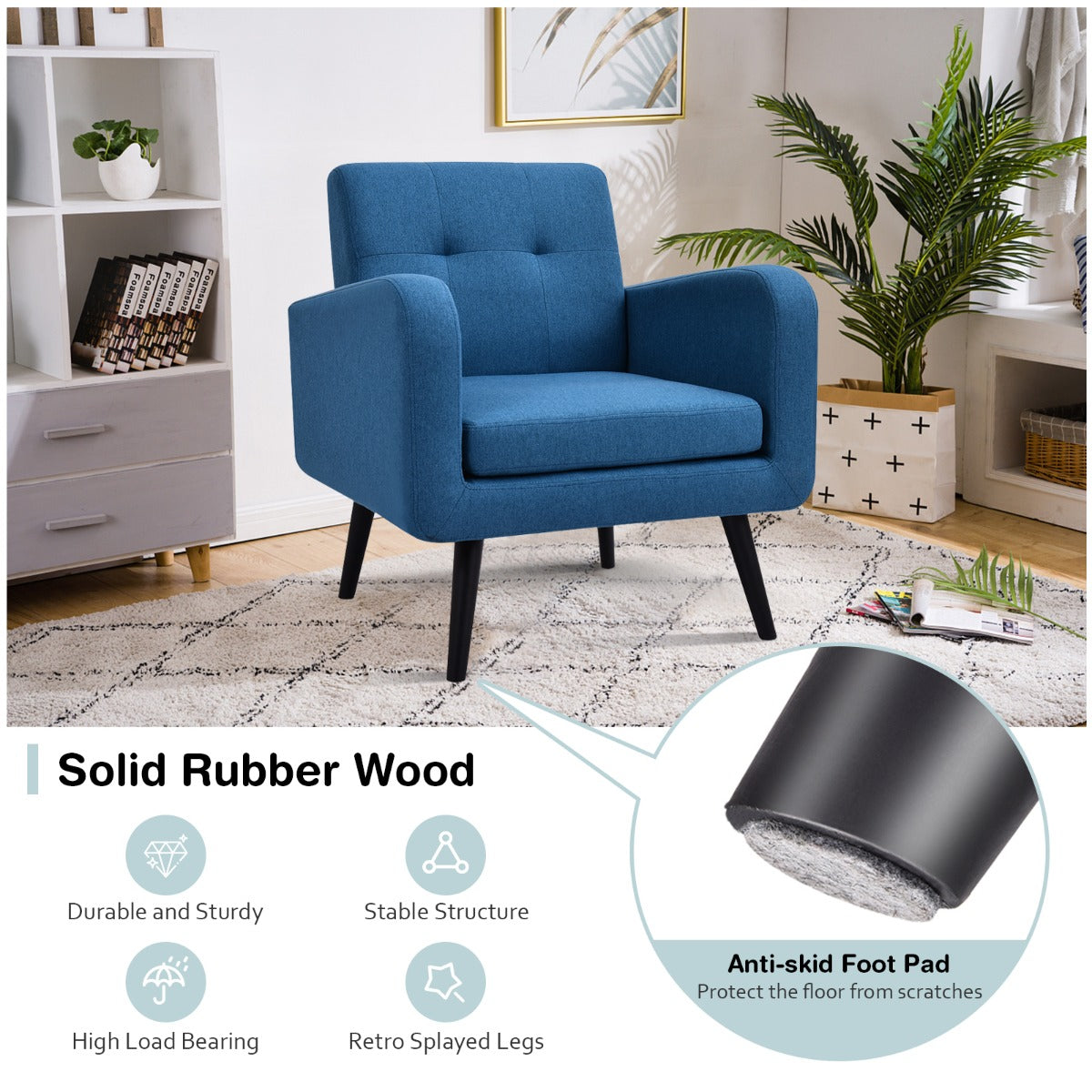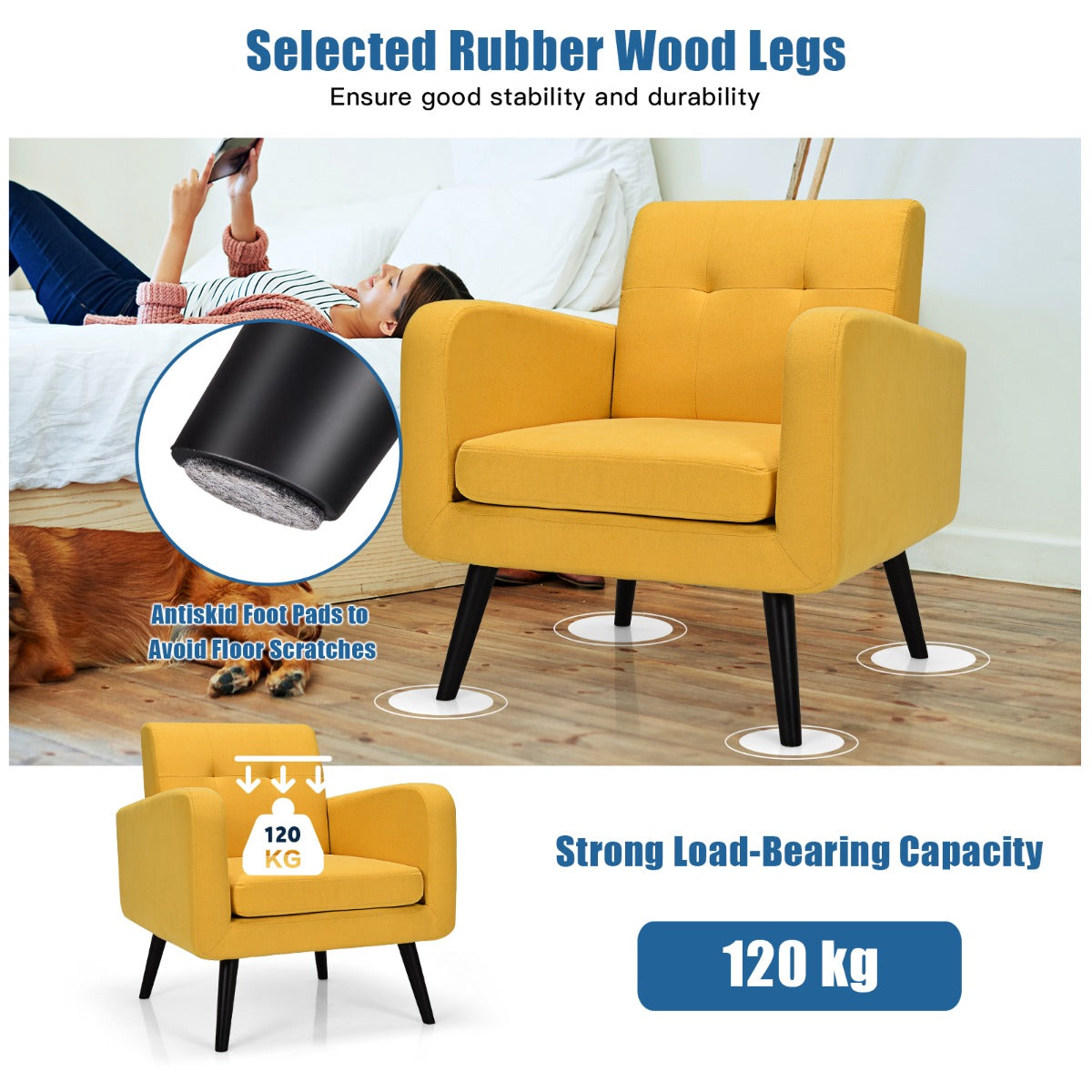 Sturdy Structure with Rubber Wood Legs: Made of premium wooden frame, this accent chair combines excellent sturdiness and lasting durability. And 4 rubber wood legs will provide great support and stability, allowing the armchair to withstand up to 120 kg without wobbling.
