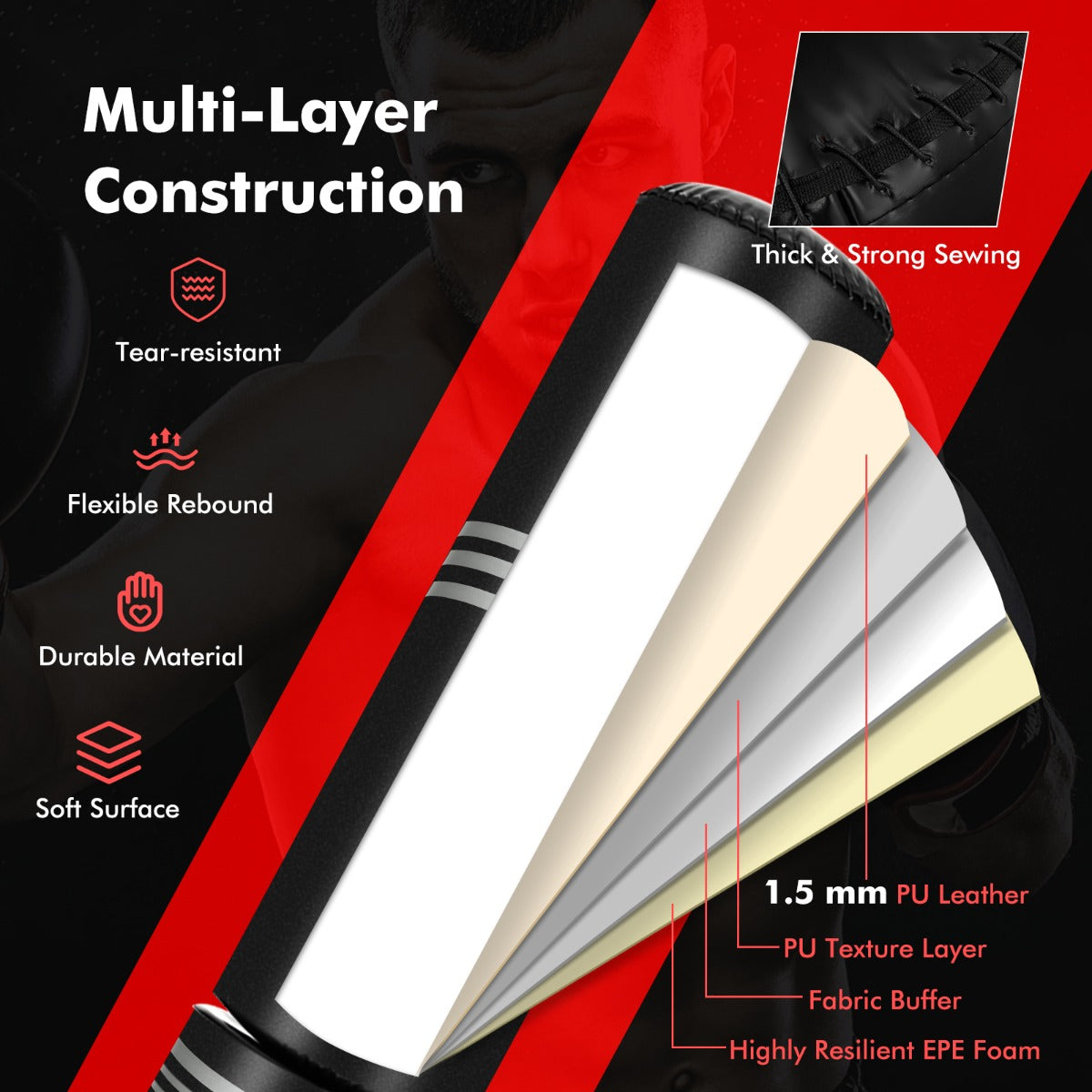 Premium Multi-Layer Construction: The boxing bag adopts multi-layer construction, including 1.5 mm PU leather cover, PU texture layer, fabric buffer and high resilient EPE foam. The PU leather surface is soft and comfortable, protecting your hands and legs from scratching. And tight sewing makes long-term onslaught possible.