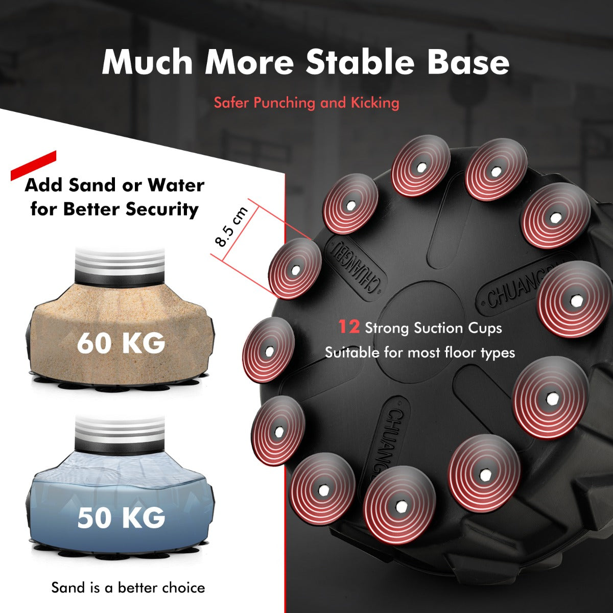 Sturdy & Stable Sucking Base: The ABS round base is equipped with 12 strong suctions cups which are available for various floor types and prevents movement on smooth surfaces. Besides, the base can be filled up to 50 kg water or 55 kg sand to make this kickboxing bag stand more stable.