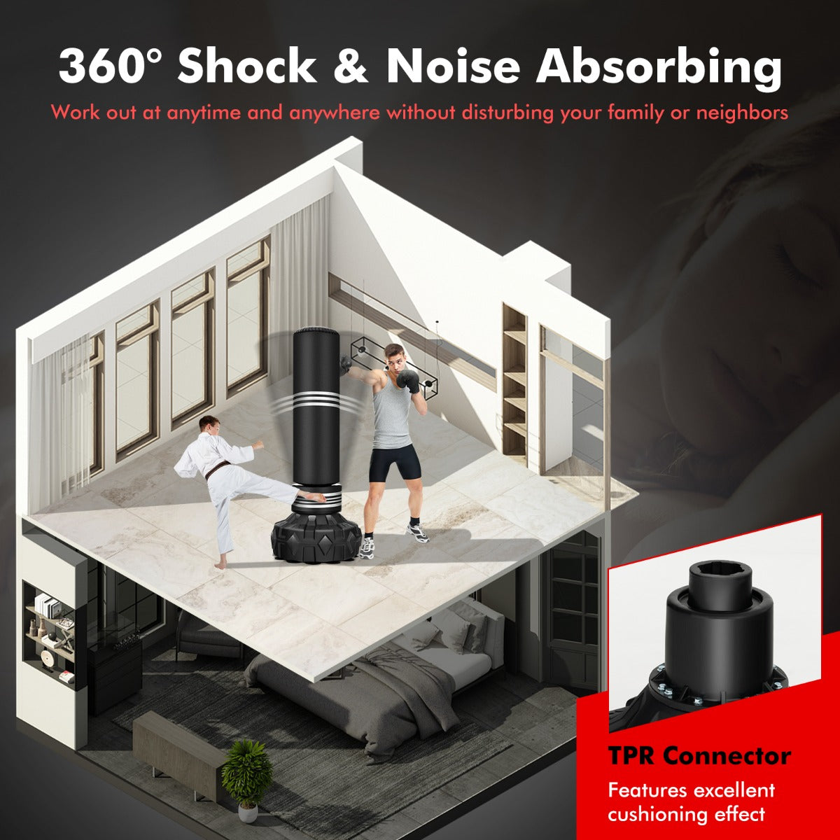 Enjoy workout with this freestanding punching bag. This freestanding punching bag comes with a foam loop to cover the connector, extending kicking area for kids and ensuring safety. The punching bag is filled with multi-layer materials and covered with comfortable PU leather, which brings fast rebound and prolonged service life. The stable base is not only equipped with strong suction cups, but also fillable with sand or water. The premium TPR connector can effectively reduce noise and absorb shock during long-term onslaught, which makes this kickboxing bag suitable for home and office. Note: the base and the punching will be delivered separately and you will receive 2 boxes. Please be patient if you only receive one of them.