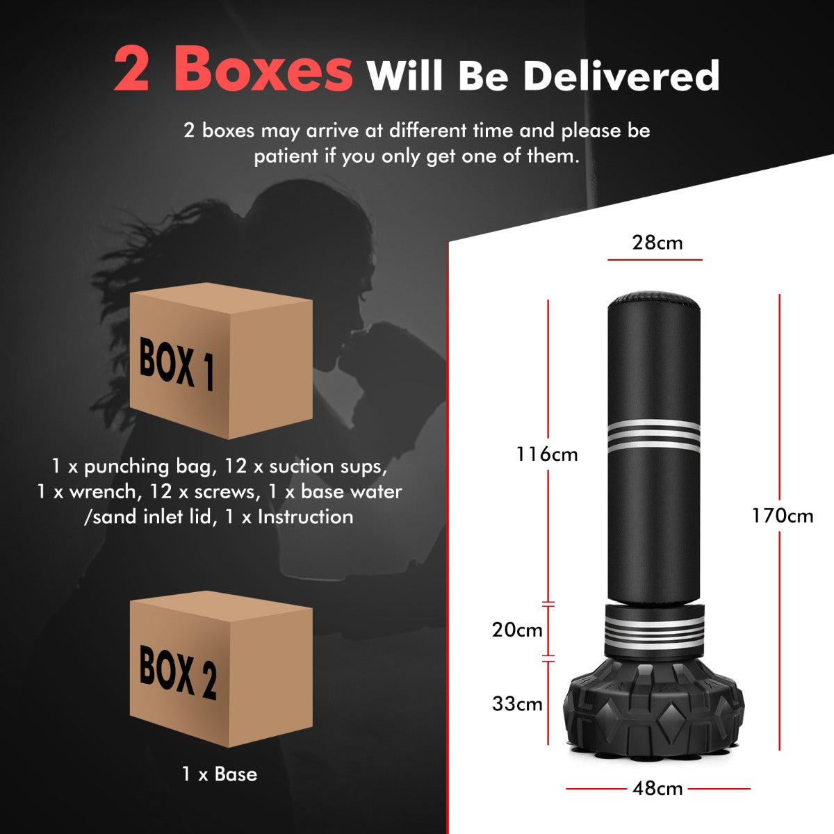 The punching bag and the base will be delivered separately in 2 boxes