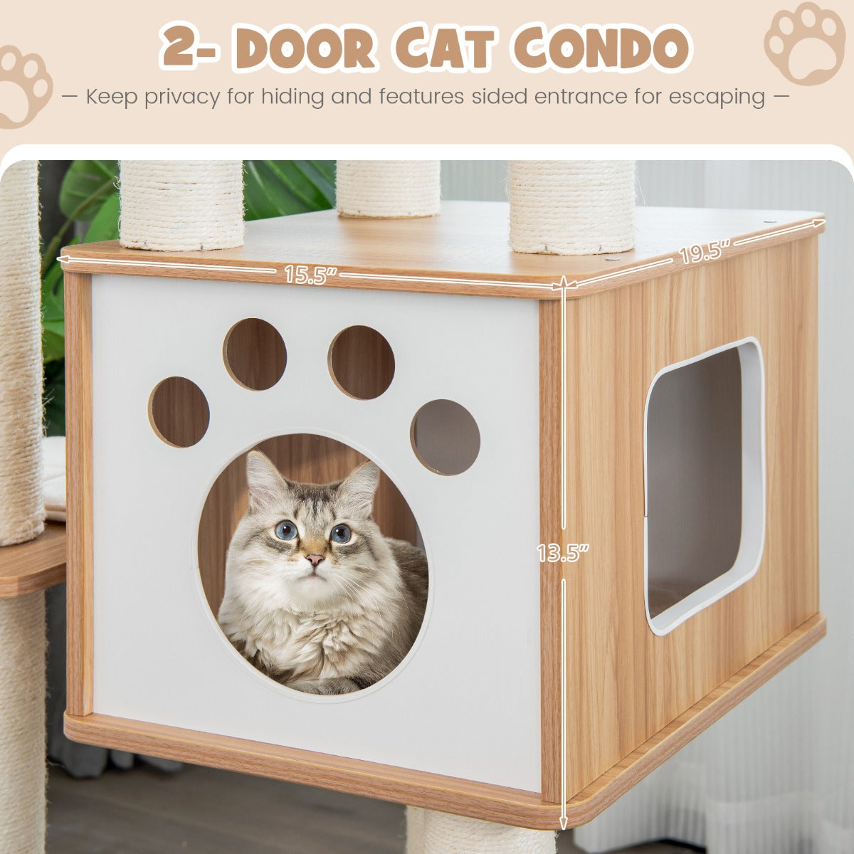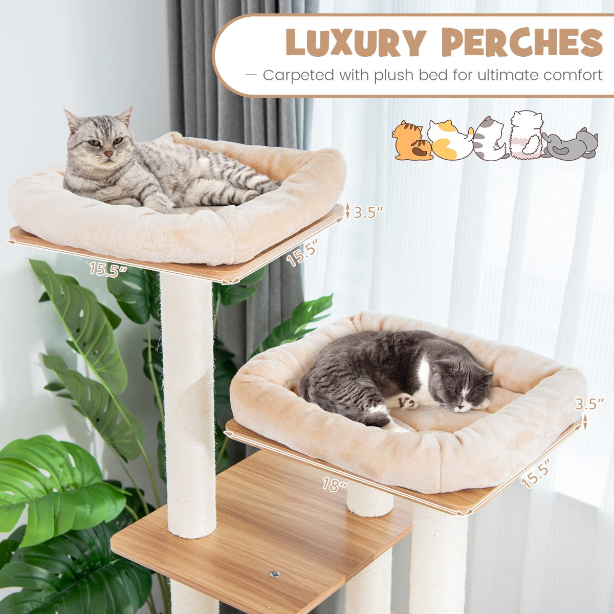 Sturdy & Stable Structure: The multi-platform wooden cat tree is made of premium engineered wood that is smooth, waterproof, scratch-resistant, and durable, ensuring a long service life. And a weighted & large base and thickened sisal posts provide strong support and guarantee a great stability. Besides, there exist, non-slip footpads, to protect your floor.