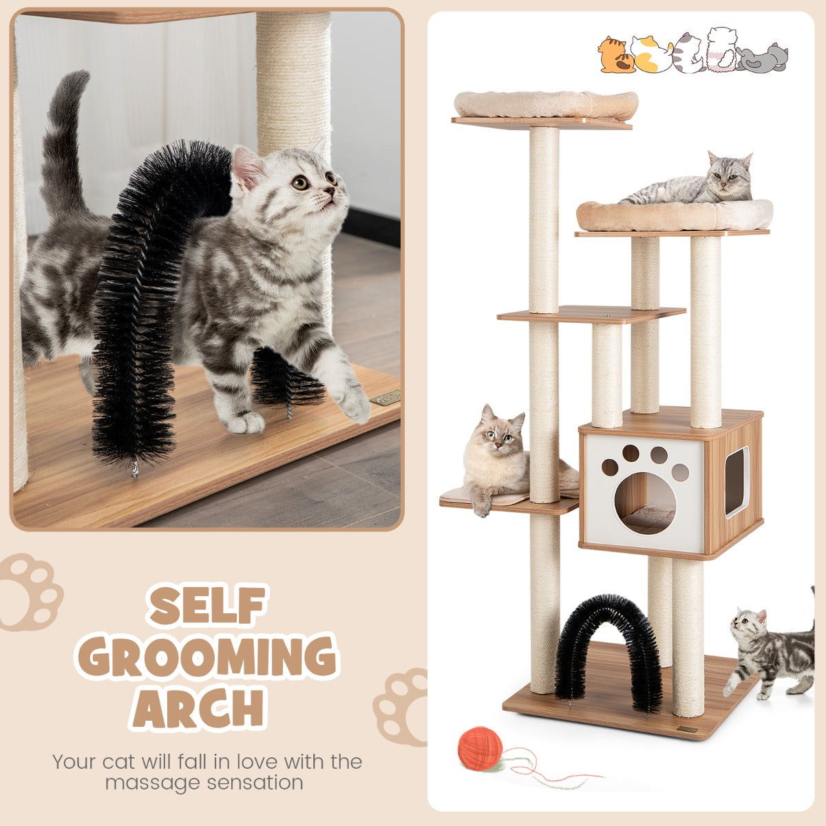 Come and Get a Luxurious Activity Center for Your Lovely Cats! No matter whether your kittens want to enjoy the feeling of the top of the world, melt into a large & deep condo, or climb up and down, this multi-purpose cat tree can meet your kitten's needs. 2 large perches with soft plush cushions provide comfortable areas to rest and overlook, and the large condo creates a sense of security to curl up for snoozing. Moreover, there exists a cat arch for the self groomers and massagers, helping stop furs from shedding everywhere and keep kittens entertained for hours. And equipped with multiple scratching posts, which are perfect for your cats to scratch and grind their claws, eliminating the worry of furniture damage. Besides, to ensure the safety of everyday use, the cat tree is made of high-quality plush covering and natural sisal ropes. Thanks to the big posts and wide & weighted base, the cat tower is ultra-stable without worrying about wobbling or tippling over. It is suitable for cats with obesity caused by lack of activities, or who damage your furniture or make a mess of rooms. This all-in-one cat tree would make your kitten's day full of full and excitement!