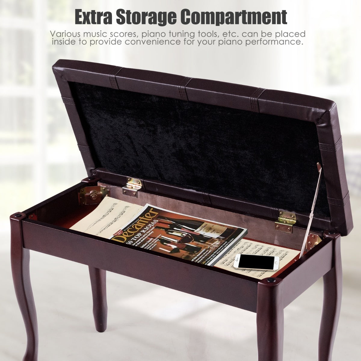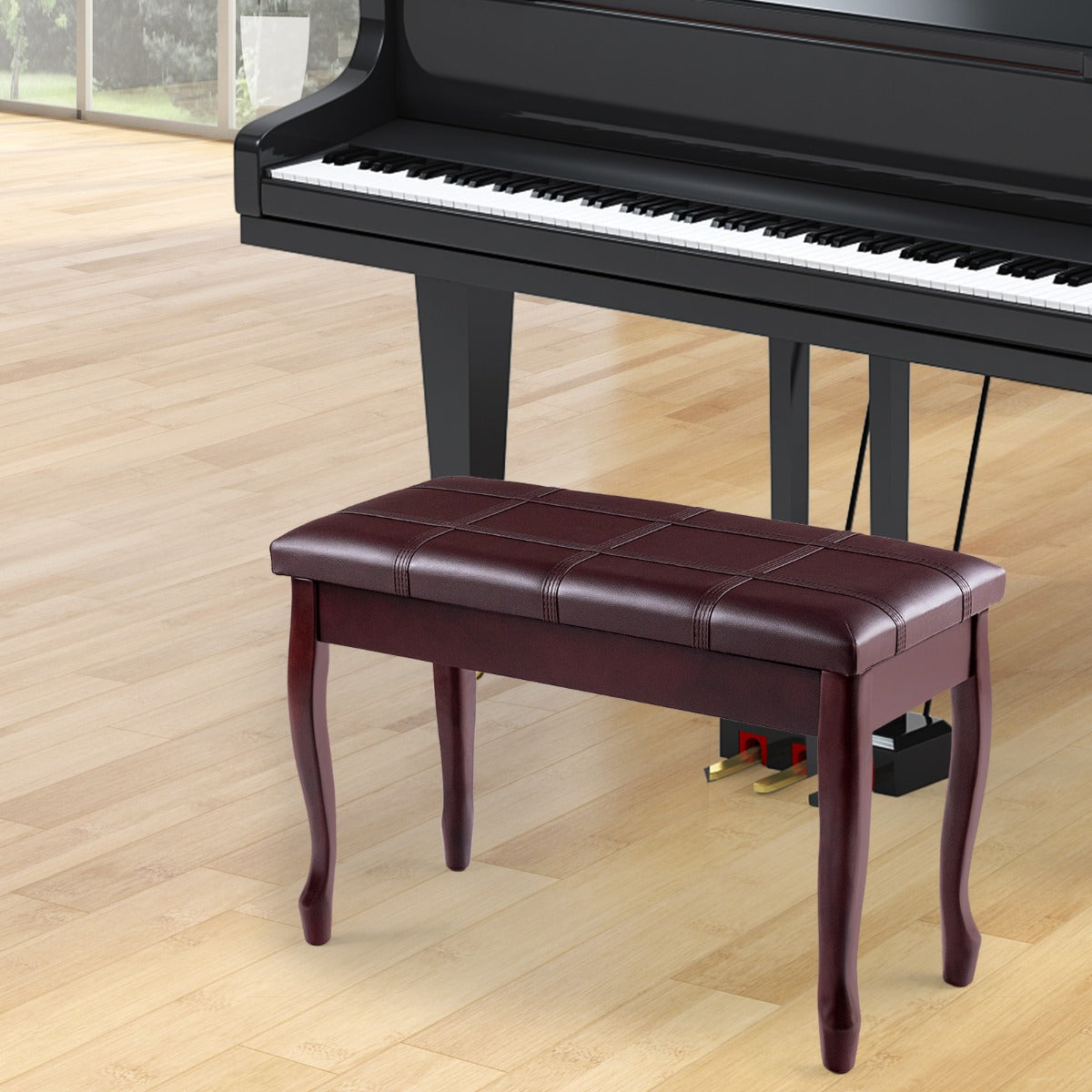 This is our high quality and stylish piano bench which offers a comfortable place for you to practice the piano. Constructed with sturdy solid wood, the piano bench can support two persons safely. Covered with PU leather and padded with high-resilience sponge, you will feel more enjoyable and relaxed. Equipped with a large storage compartment under the seat that provides specious space for holding sheet music and books. What's more, it has anti-slip feet pads under wooden legs, protecting your floor from being scratched. Don't hesitate to buy one!