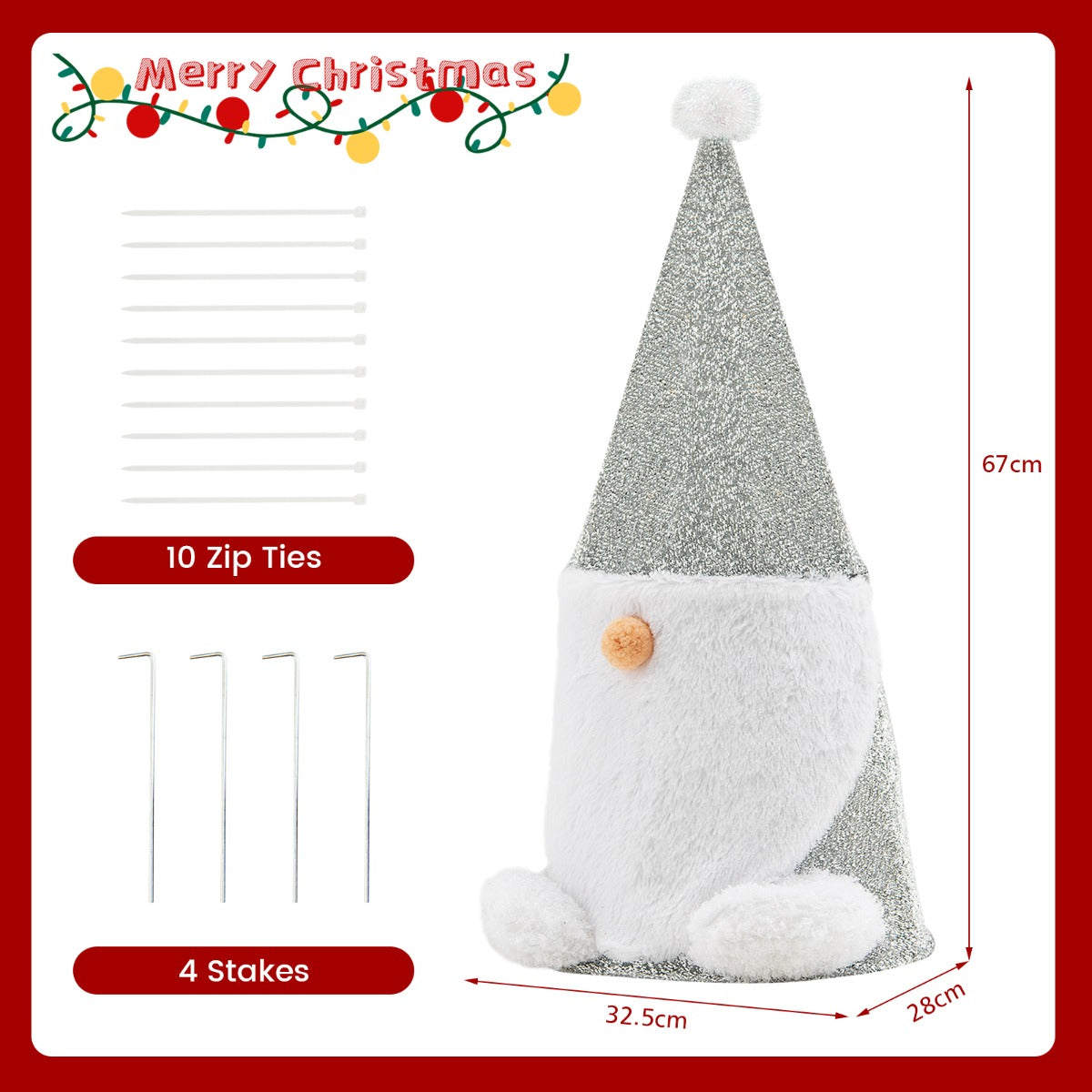 This Christmas decoration features a sliver and white Gnome appearance. The fluffy nose, beard and hat ball make it more adorable. This holiday indoor decor comes with a long power cord, and the built-in warm white LED lights enable you to immerse in a rich festival atmosphere. With the anti-rust steel frame and high-quality cover, this Gnome decoration has a stable structure and can decorate your home for a long time. If you need to, you can place it outdoors to decorate the yard, garden or lawn by using the included nails. It is a perfect decoration for Christmas, party or other holidays.